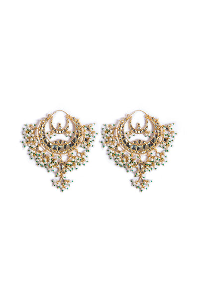 Adorned with a delicate blend of dull gold and multi-colored beads giving it a traditional look. These bali style earrings are enhanced with a sentimental Indian poth pyroi with a tint of green poth, sahara by adding a traditional motif studded with glass cut stones in a chand look escorted by a tint of red kairki.