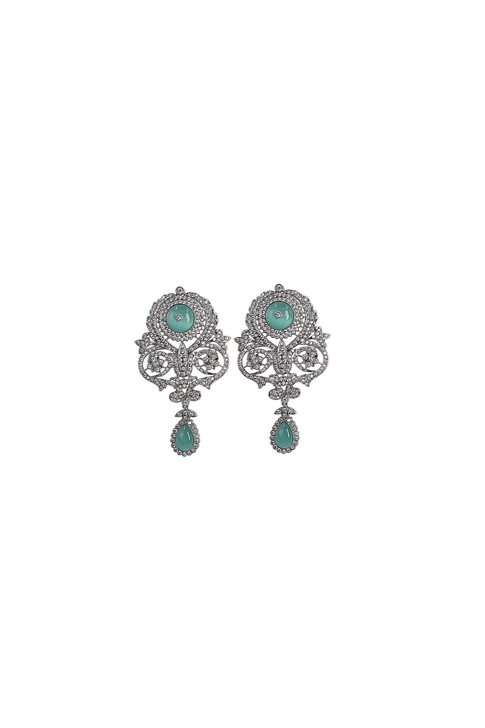 Materials: Cat's Eye & Zircons Color: Mint Green Cat's Eye & White Metal: Alloy Finish: Silver Back Pin: Sterling Silver Stud Product Care: Wipe Clean