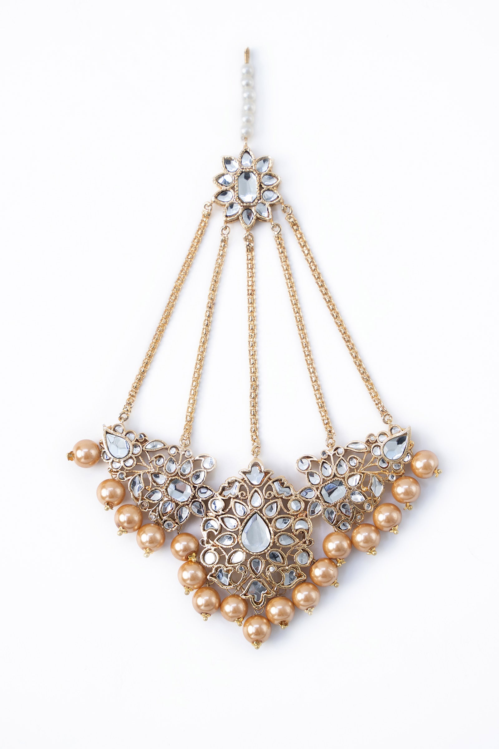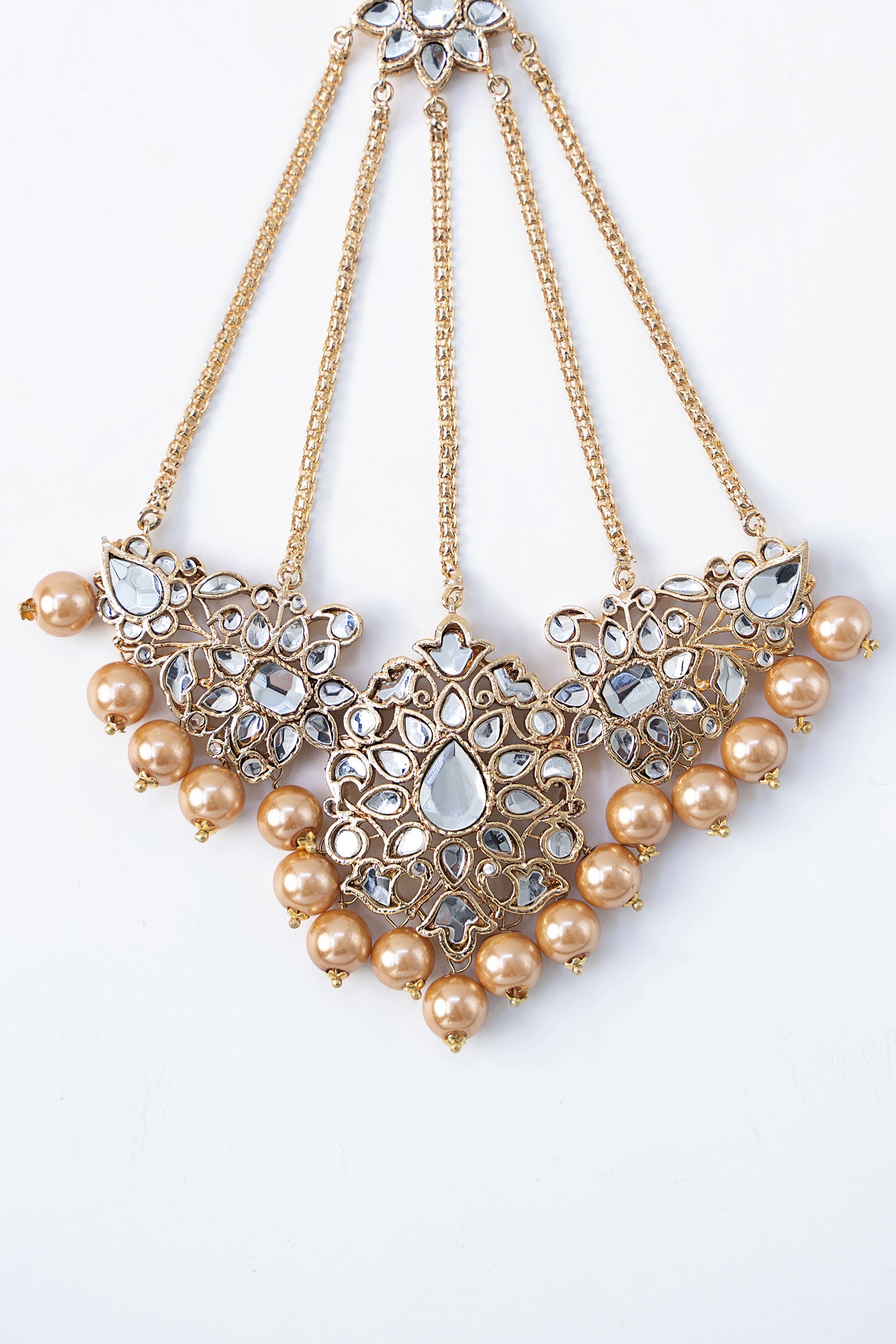 Our Mahraani Bridal Jhoomar makes the perfect pair to your bridalwear and complements it perfectly with the shine of handcut glass stones finished with round golden pearls and gold plating. It is a specimen of excellent craftsmanship with its intricately curated design.