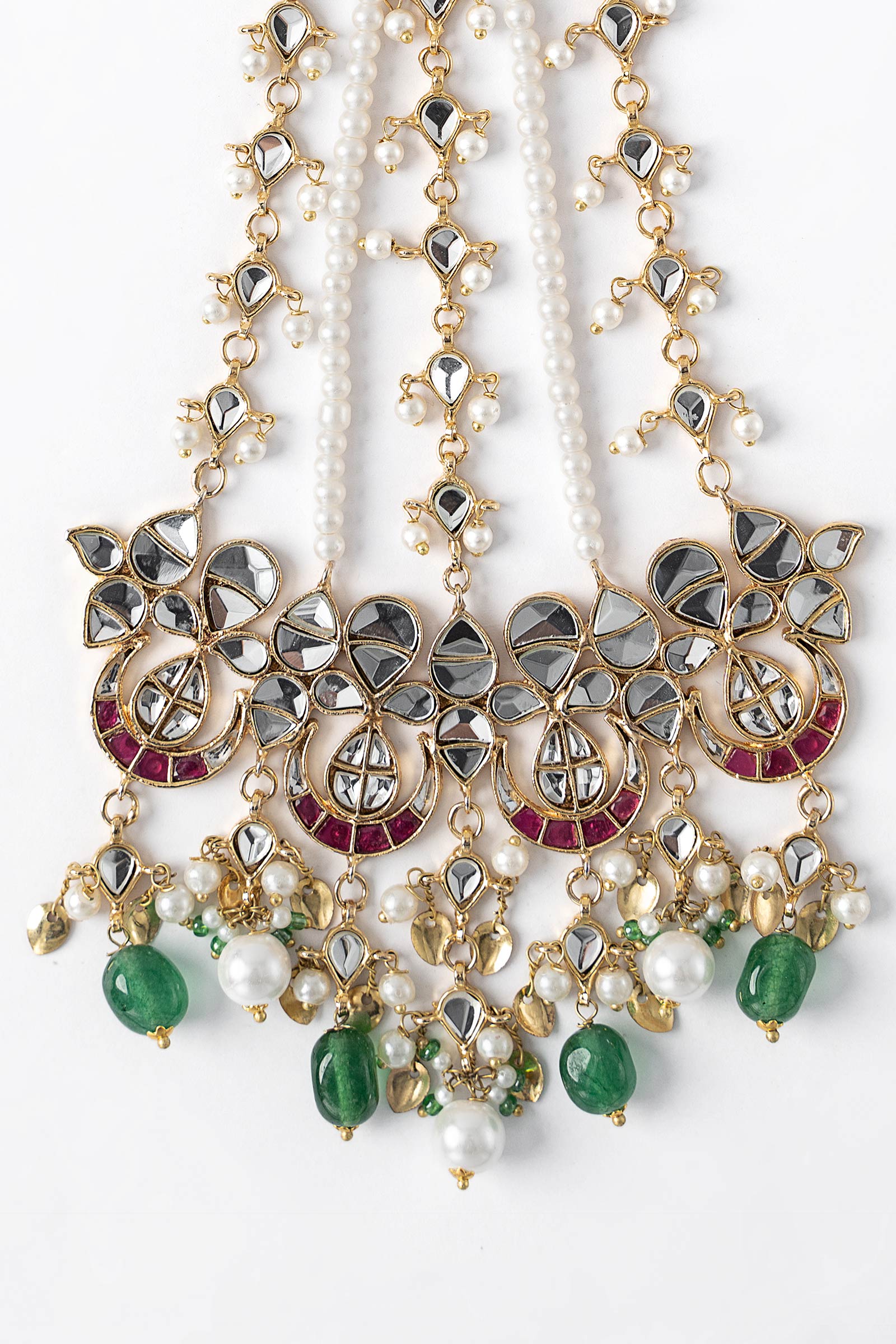 Get ready to fall in love with this classic piece of jewelry. Rooted in elegance, this traditional Malika Bridal Jhoomar is crafted with handcut glass stones with pink chatham, white pearls, and metal leaves pyroi with hanging green onyx, making it a symbol of elegance that effortlessly completes the look.Finish: 21K Gold PlatedProduct Care: Wipe Clean