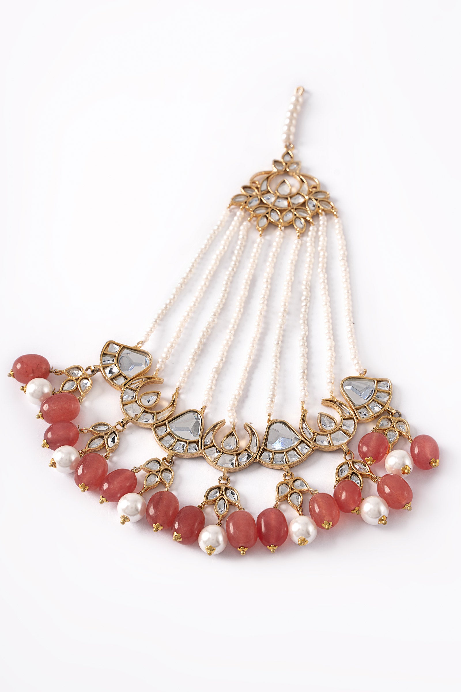 Gauhar Bridal Jhoomar inspired by traditional artistry, showcases handcut glass stones with white pearls pyroi, and pink quartz hanging. This accessory is very versatile and pairs well with your big day outfit.Finish: 21K Gold PlatedProduct Care: Wipe Clean