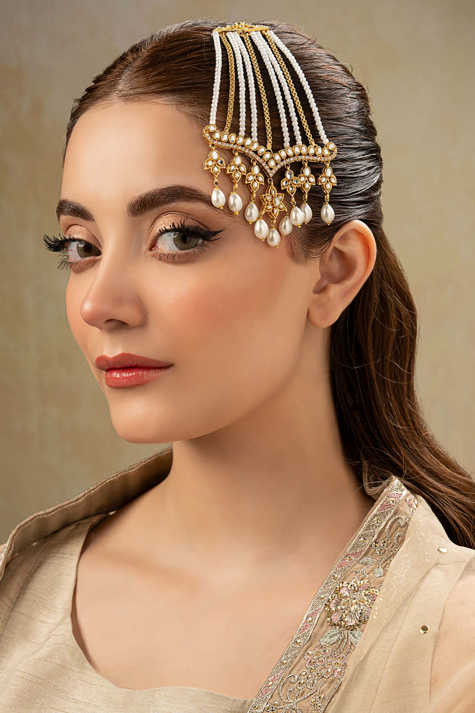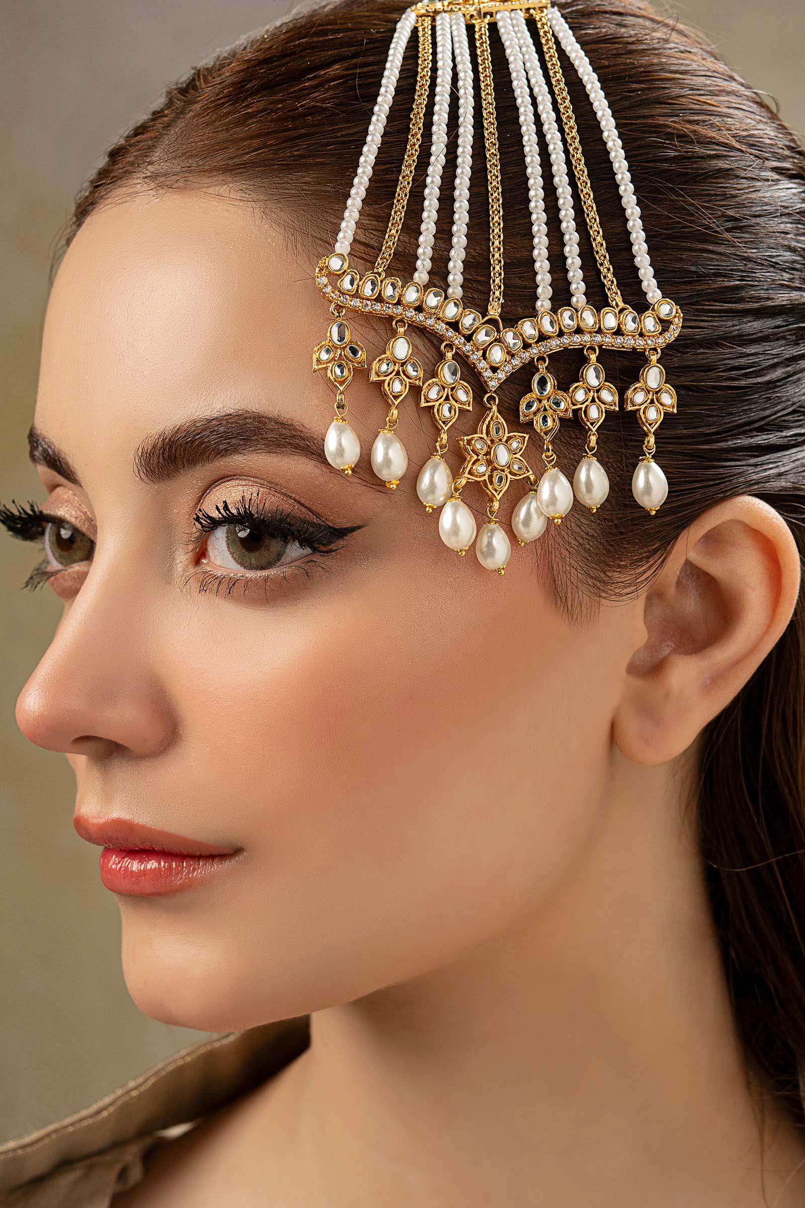 Inspired by the most enduring symbols of vintage artistry, our Floral Drop Jhoomar features Handcut glass stone florets embellished with glistening white zircons. It is held together with heavenly pearls, to highlight the overall aesthetics it is finished with pearl drop and chain pyroi that add sophistication to your overall look. Finish: 21K Gold Plated Product Care: Wipe Clean