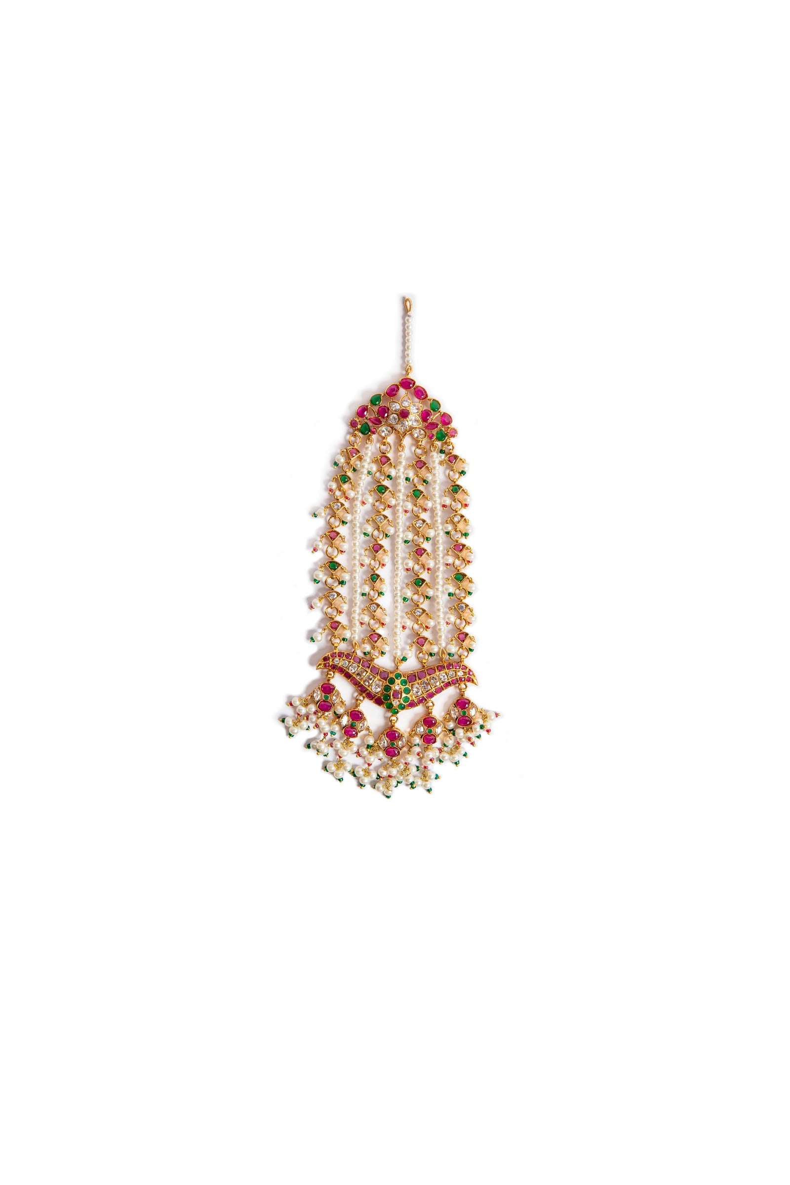 A traditional wedding wear jhoomar in multicolour stones in green and red stone with hand-cut glass cutting goes together with hanging small motifs with pearl pyroi is perfect for wedding wear.