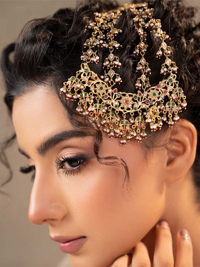 Drenched in festive opulence, this stunning jhoomar is adorned with the soft glow of pink chatham, the deep richness of green onyx, and the radiant sparkle of white zircons. Finished with graceful pearl piroi and a bold touch of red poth, it’s a timeless piece that captures the spirit of celebration with every shimmer and sway.