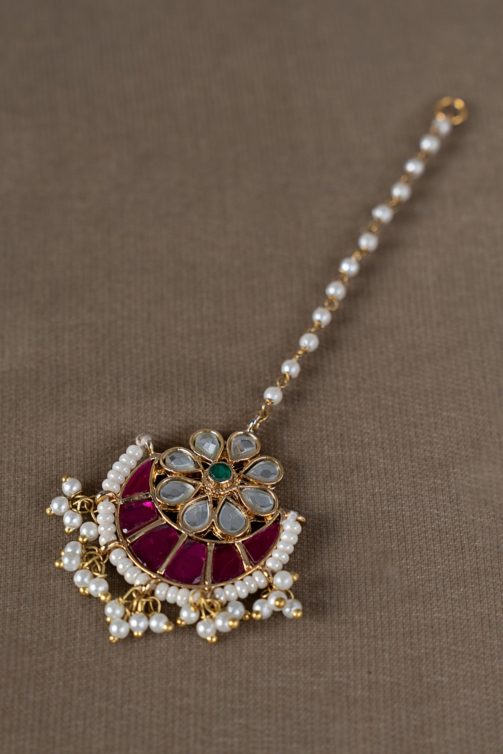 Whimsically elegant, this kids’ tikka shimmers with pink chatham accented with green onyx and delicate white handcut glass artsitry with a finishing of indian poth piroi, cojoining it a delicate pearl sahra that not only highlights its aesthetics but makes it a perfect blend of classic grandeur and playful, romantic charm. Composition: 21K Gold Plated Care Instructions: Wipe Clean