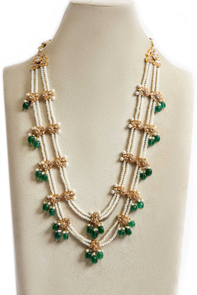Alluring double-layer maala necklace presenting sapphire blue hanging stones with hand-cut glass stones and a green pearl pyroi accent, motif adorned with studded stones delightfully designed with back tilla doori.