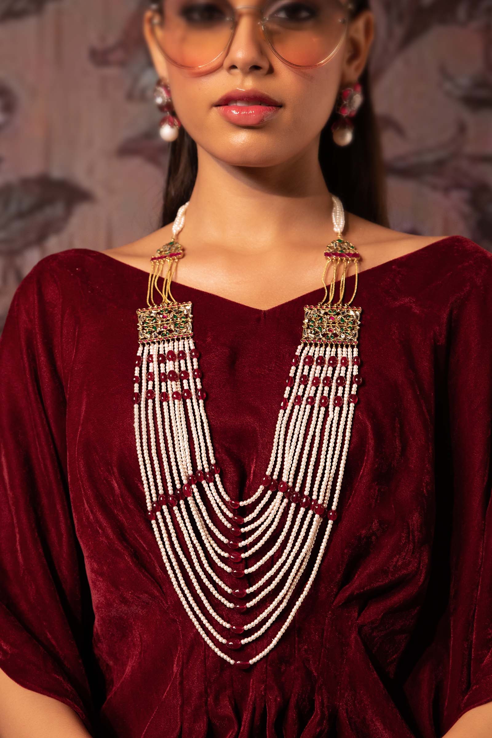 Materials: Chatham, Onyx, Handcut Glass & Pearls Color: Pink Chatham, Green Onyx, Dark Pink Onyx & White Metal: Alloy Finish: 21k Gold Plated Product Care: Wipe Clean