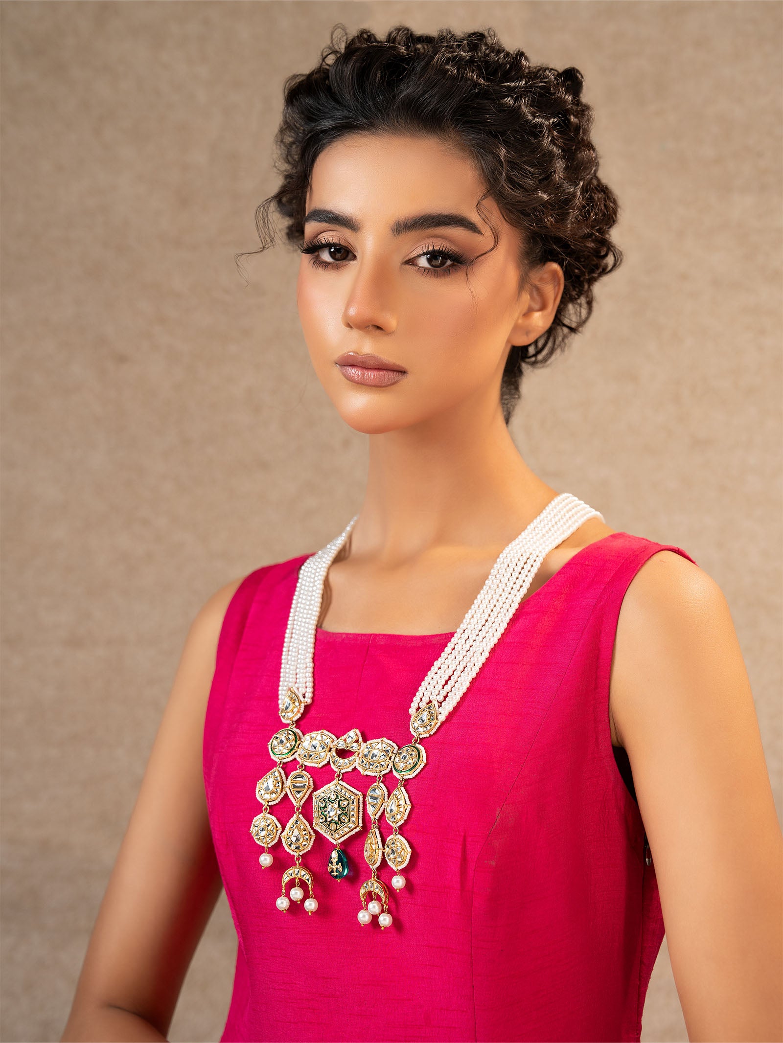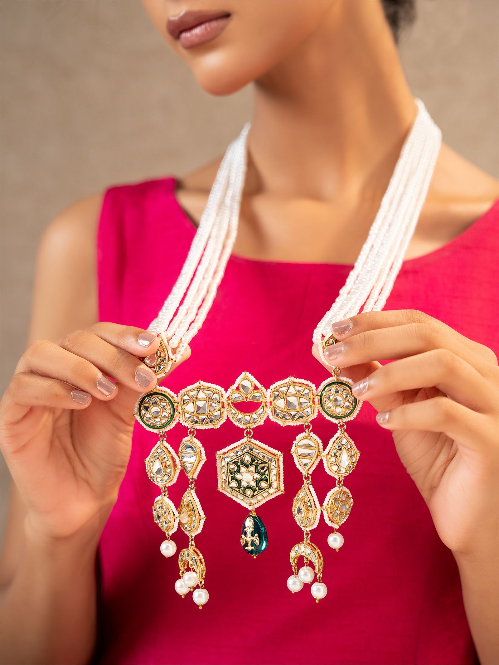 With gorgeous white handcut glass, teal green stones, and delicate white pearls dangling from it, this gorgeous mala exudes festive elegance. This piece is the ideal fusion of tradition and classic beauty to enhance your look, especially when paired with elaborate Indian poth pyroi and vivid green enamel. Finish: 21K Gold Plated Lock: Dori Product Care: Wipe Clean