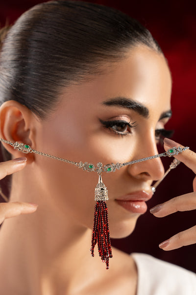 Bold and vibrant, this pendant combines the brilliance of white zircons with the rich depth of green onyx, accented by striking red poth piroi. A contemporary twist on traditional elegance, designed to make your festive look unforgettable.