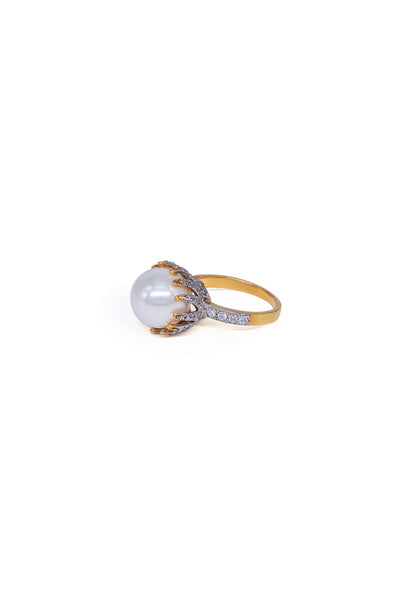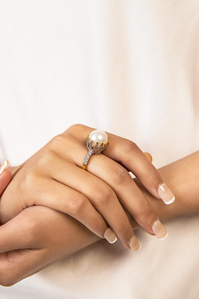 Design brilliance takes shape with this ring in 21K gold plating. A round pearl is accentuated with zircon stone setting in a ganga jamni finish to let the elegant side of you shine. Alloy metal