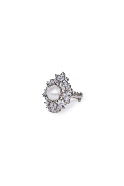 A gleaming white zircon floral motif encircles a half round pearl on this stunning adjustable ring with a silver plated finish for the most elegant evening look. Alloy metal