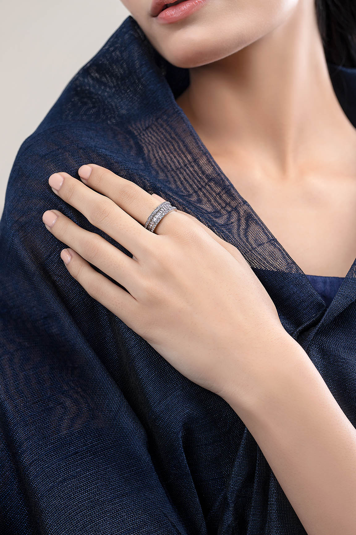 Timeless yet elegant. This ring displays a chic zircon diamond band, studded with white baguette-shaped zircons intricately surrounded with delicate round zircons on the sides. Its simple design crafted in a shining silver polish makes it a perfect style statement for everyday wear.