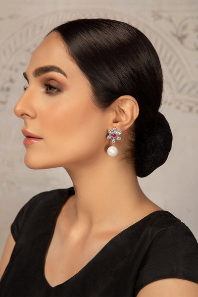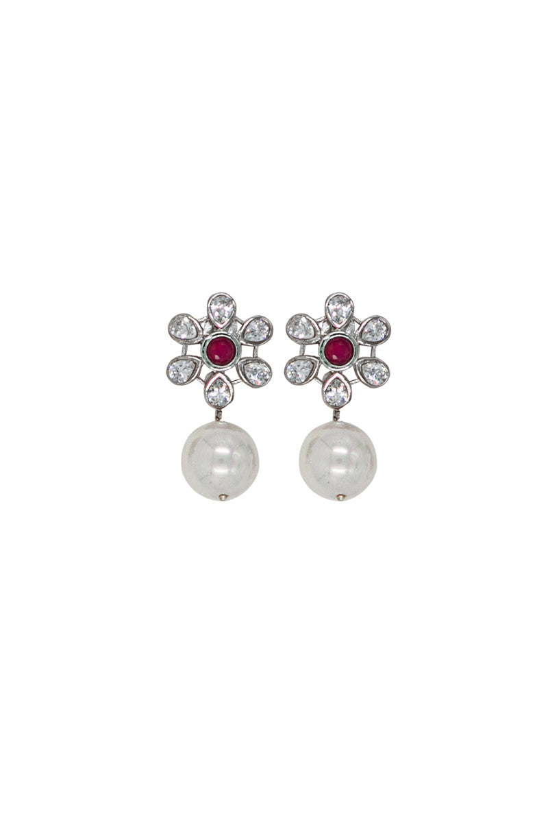 Rhodium plated floral pattern inspired stud earrings, scintilating statement upon the ear chatham stone on the centre with dangling shalper pearl.
