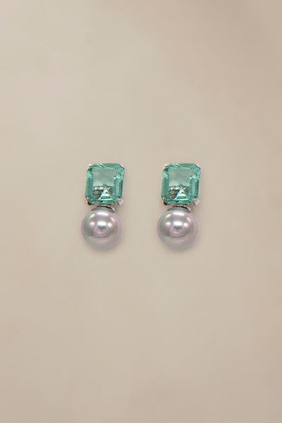 A minimal ear studs with a beuatiful aquamarine crytal and grey hanging pearls for a simple understated look.