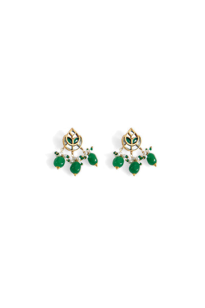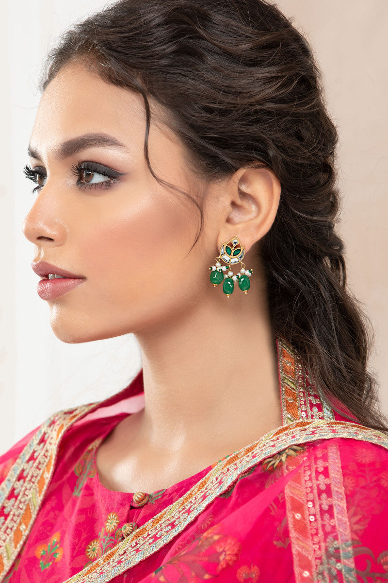 A pure reflection of statement artisan jewelry, these designer earrings have been handcrafted with handcut glass stones with pearl white, ruby red, emerald green and powder pink hanging stones in a 21K gold plated finish.