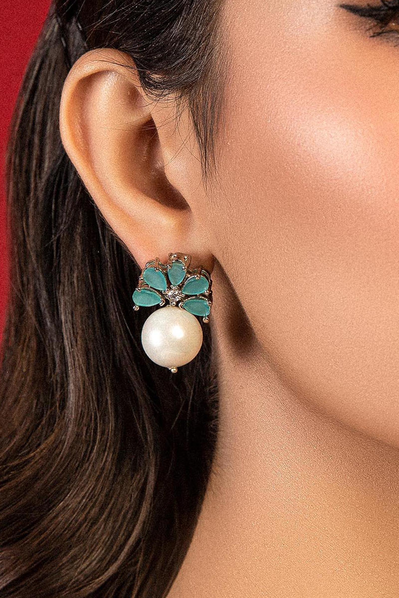 The perfect stud back with a silver pin attaches to an (blue cats eye) aquamarine earring with an off-white round pearl perfect for everyday wear. Alloy metal