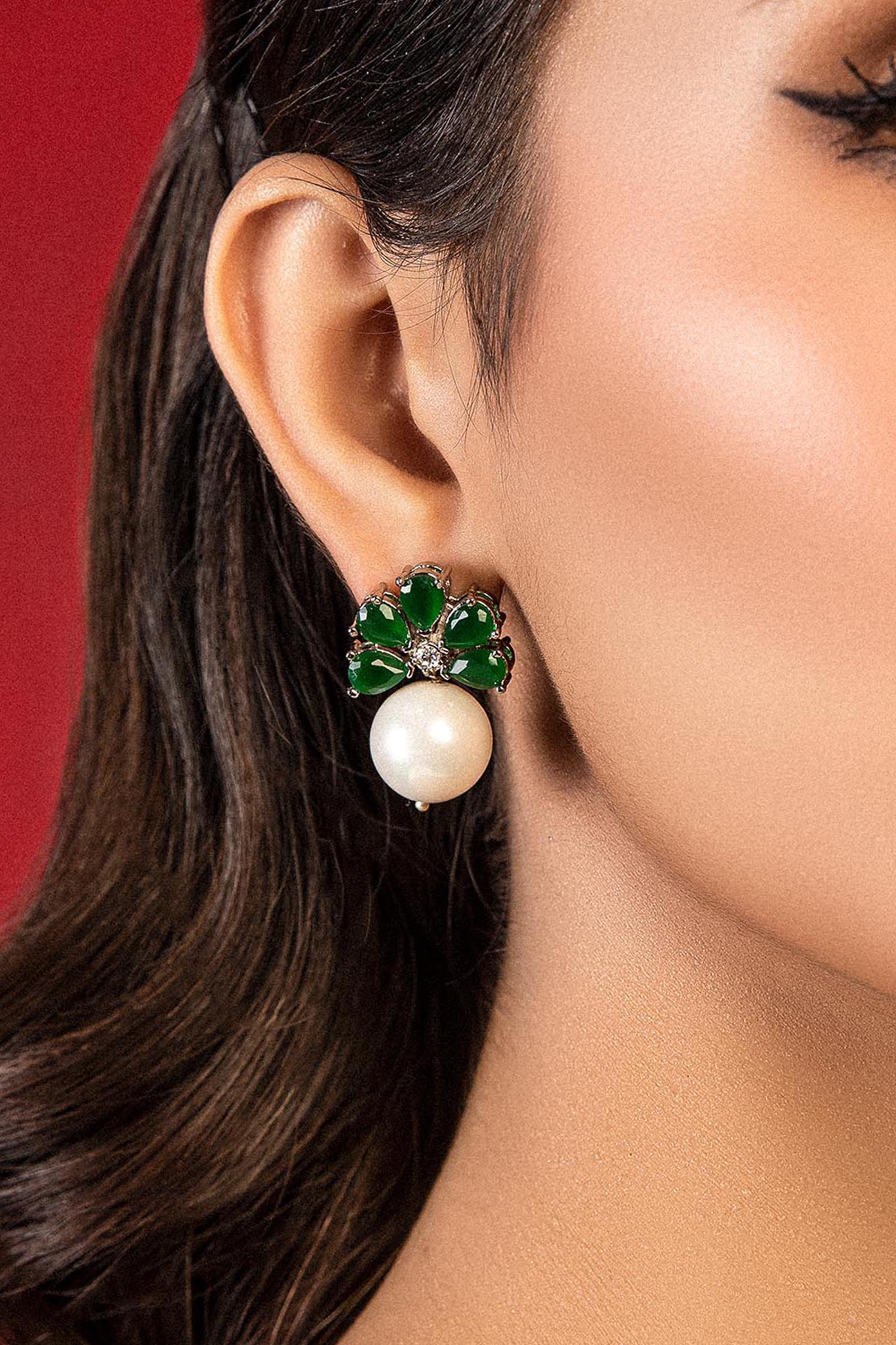 The perfect stud back with a silver pin attaches to a green onyx earring with an off-white round pearl perfect for everyday wear. Alloy metal