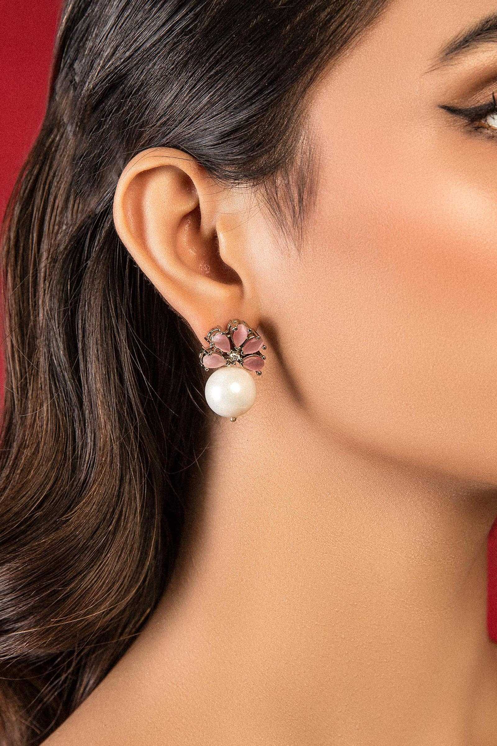 The perfect stud back with a silver pin attaches to a pink cat's eye earring with an off-white round pearl perfect for everyday wear. Alloy metal