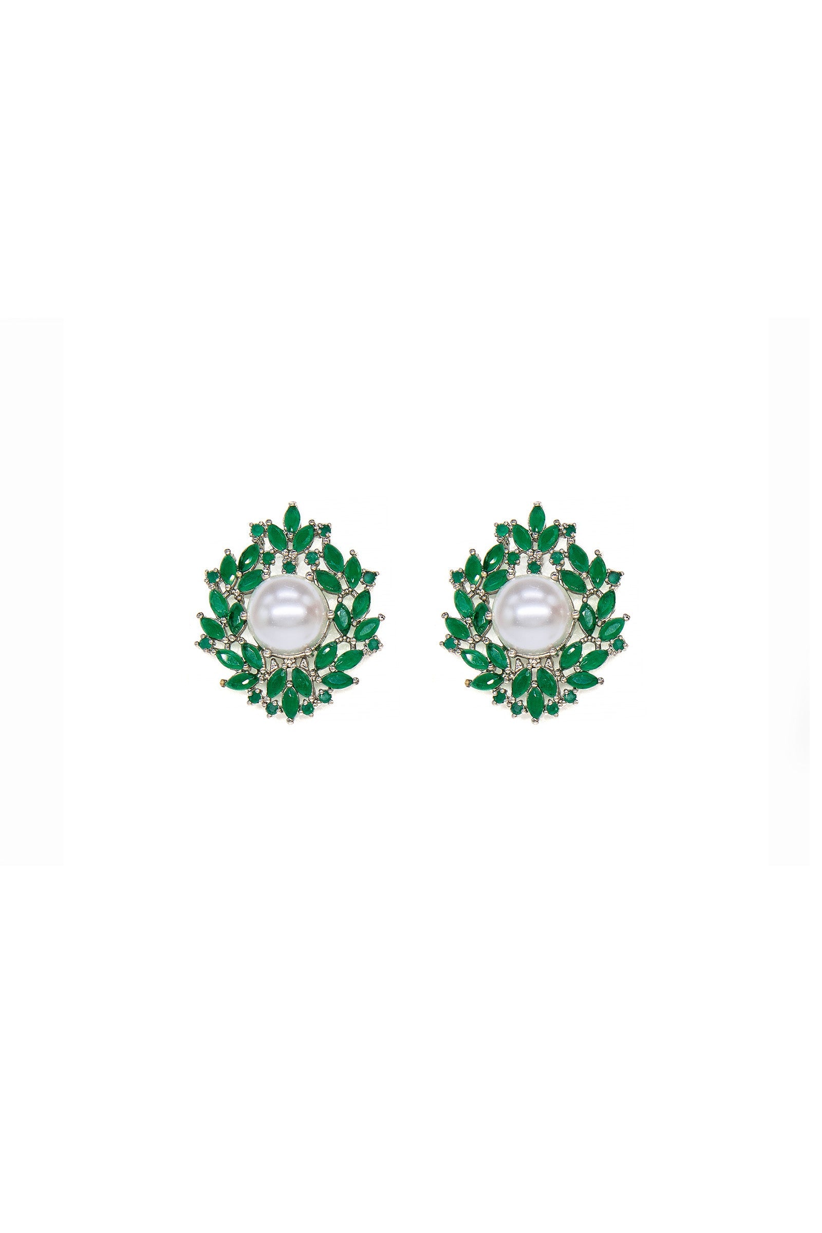 A gleaming green onyx floral motif encircles a half round pearl with a silver plated finish for the most elegant evening look. Alloy metal