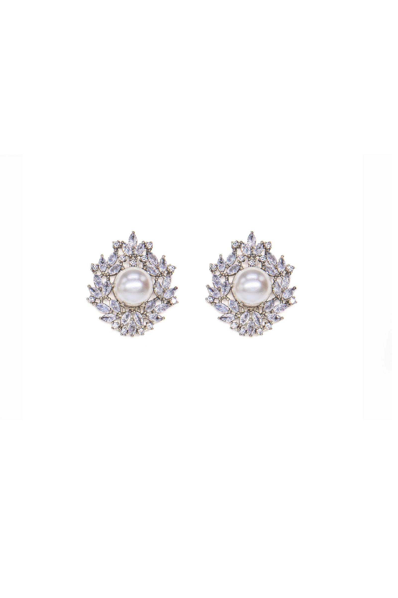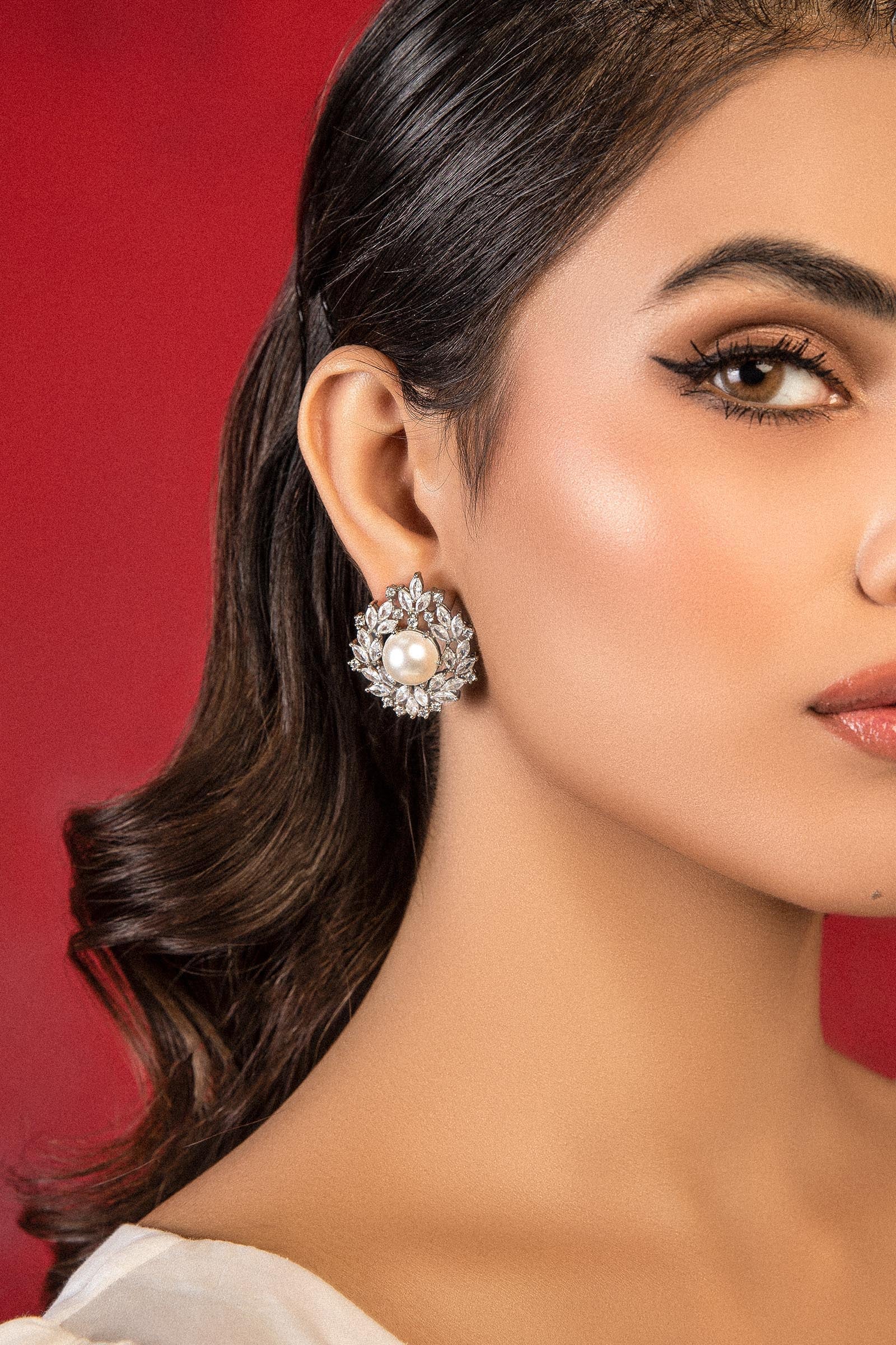 A gleaming white zircon floral motif encircles a half round pearl with a silver plated finish for the most elegant evening look. Alloy metal