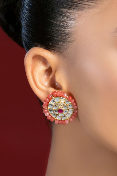 Relive the era of royalty with our traditional stud earrings featuring handcut glass stones in a signature kundan style with pink chatham stone in the center motif & piroyi of powder pink stones around the stud in 21K gold plating.