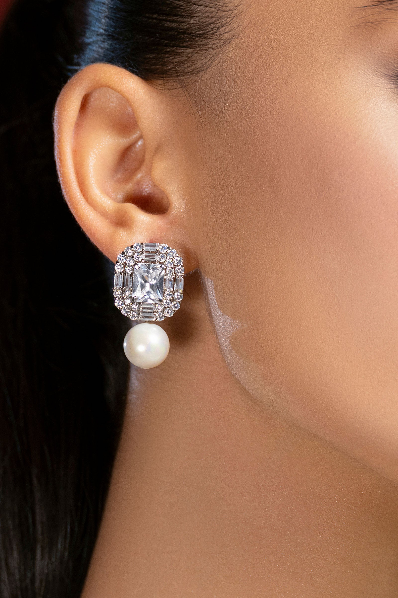 A centered emerald cut zircon sparkles inside an ornamental parterre of white baguette zircons along with a drop pearl for the most ultimate chic evening wear look.Made in PakistanDisclaimer: Most of the pieces are individually Handcrafted with natural embellishments like semi-precious Stones. The natural material contains irregularities and therefore slight variations in color, shape, and size in the same article may occur and will not be considered damaged or defected.