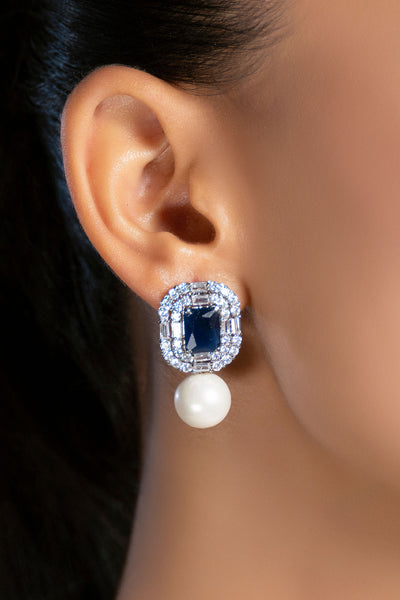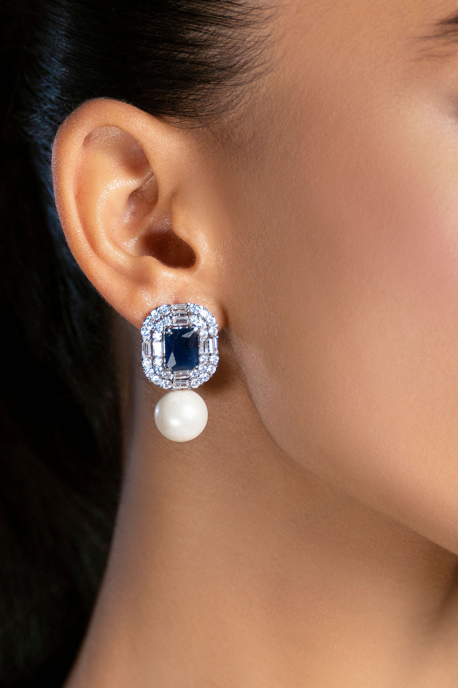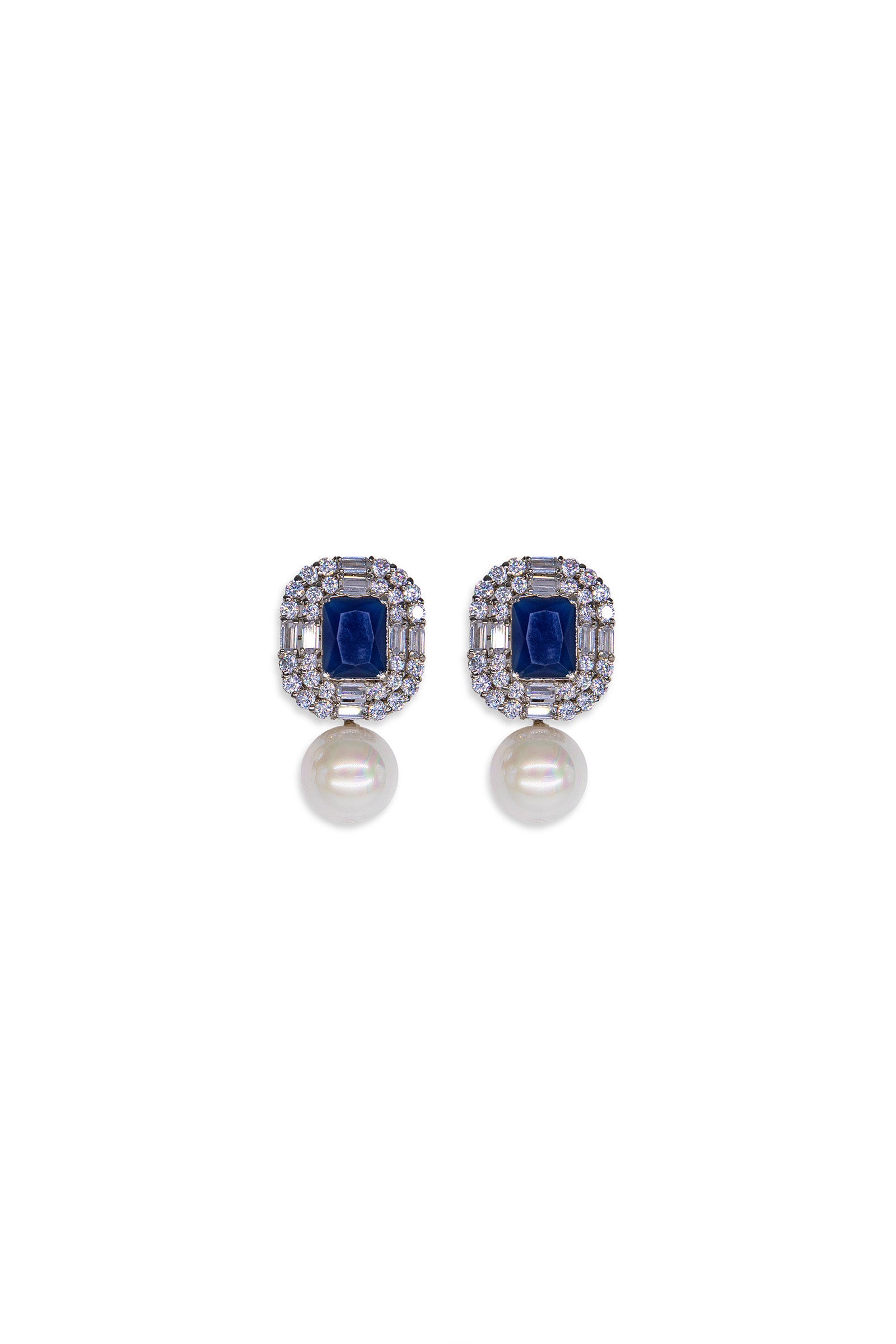 A centered sapphire blue stone sparkles inside an ornamental parterre of white baguette zircons along with a drop pearl for the most ultimate chic evening wear look.
