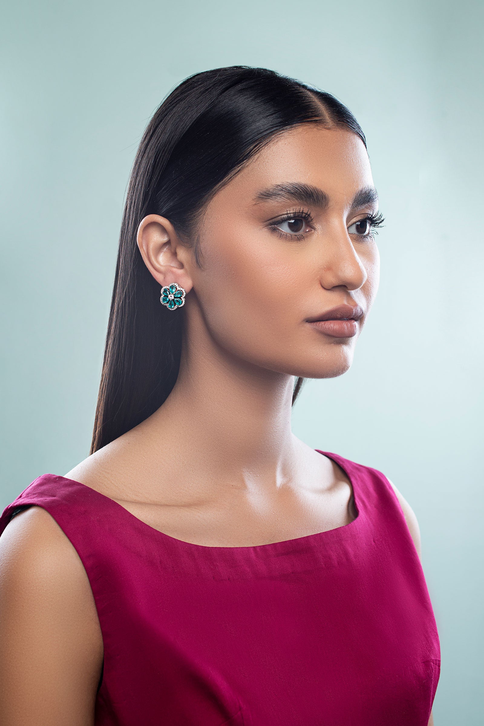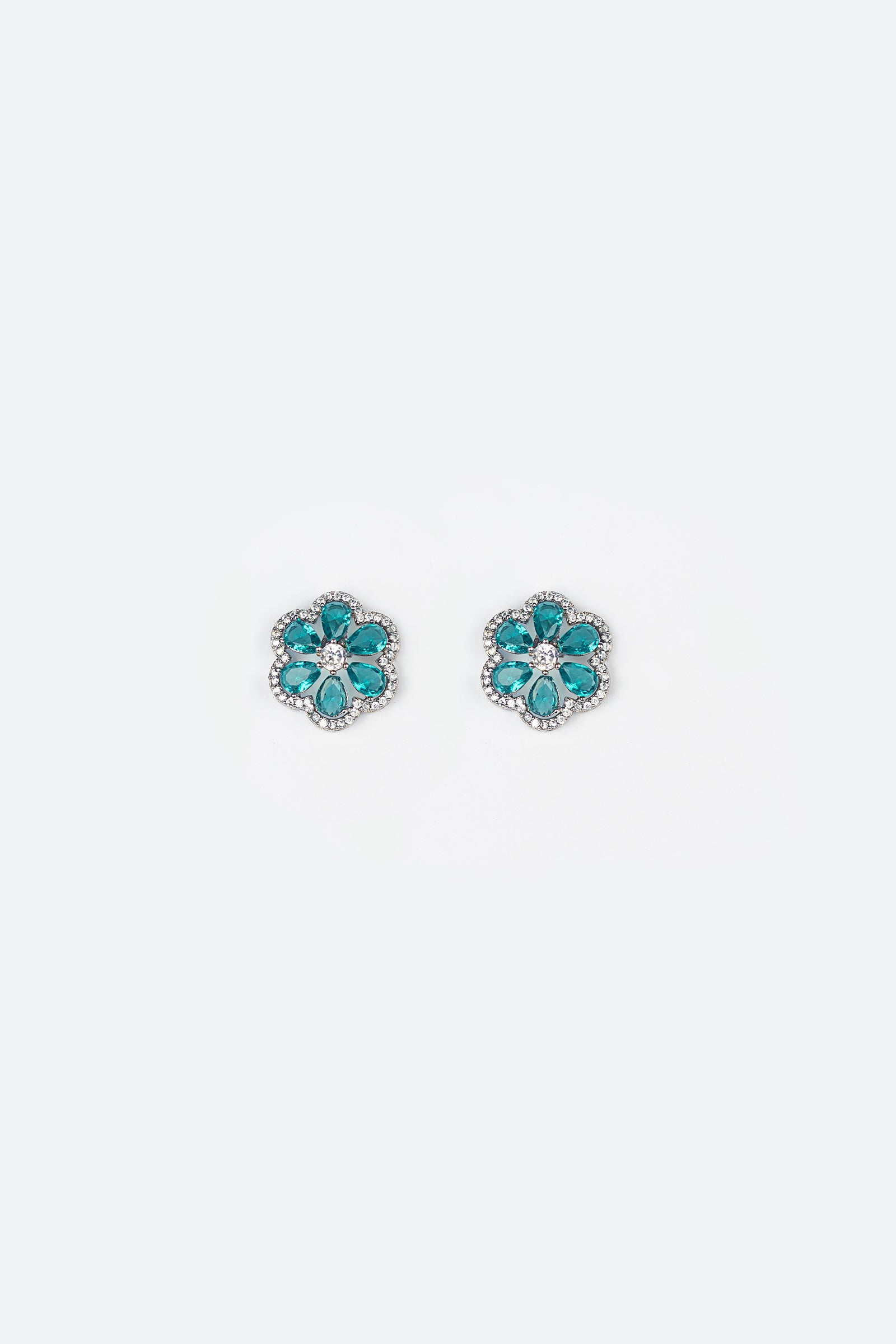 Materials: Crystal & Zircons Color: Teal Blue & White Metal: Alloy Finish: Silver Back Pin: Sterling Silver Stud Product Care: Wipe Clean