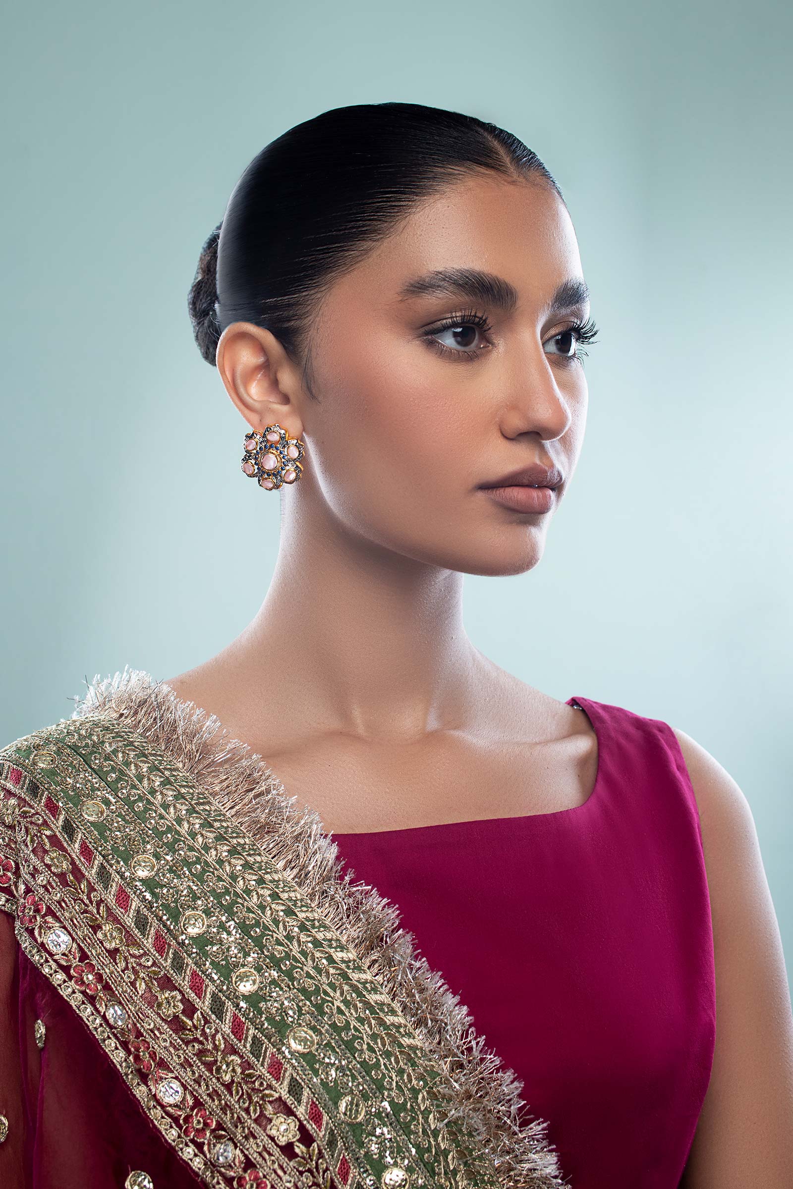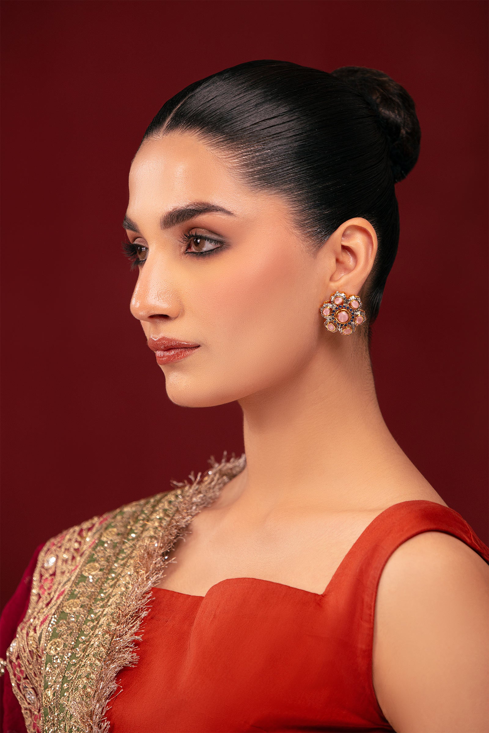 Materials: Cat's Eye & Onyx Color: Pink Cat's Eye & Blue Onyx Metal: Alloy Finish: Ganga Jamni Back Pin: Sterling Silver Stud Product Care: Wipe Clean