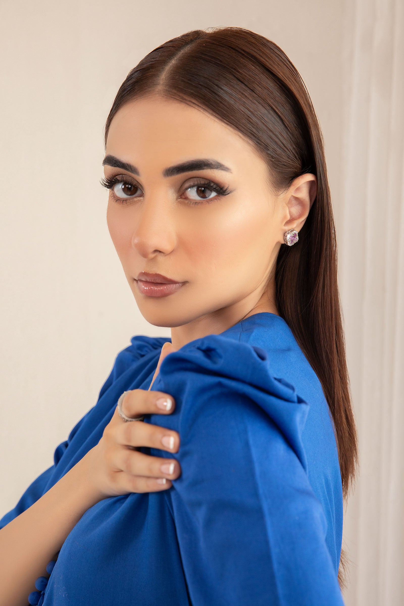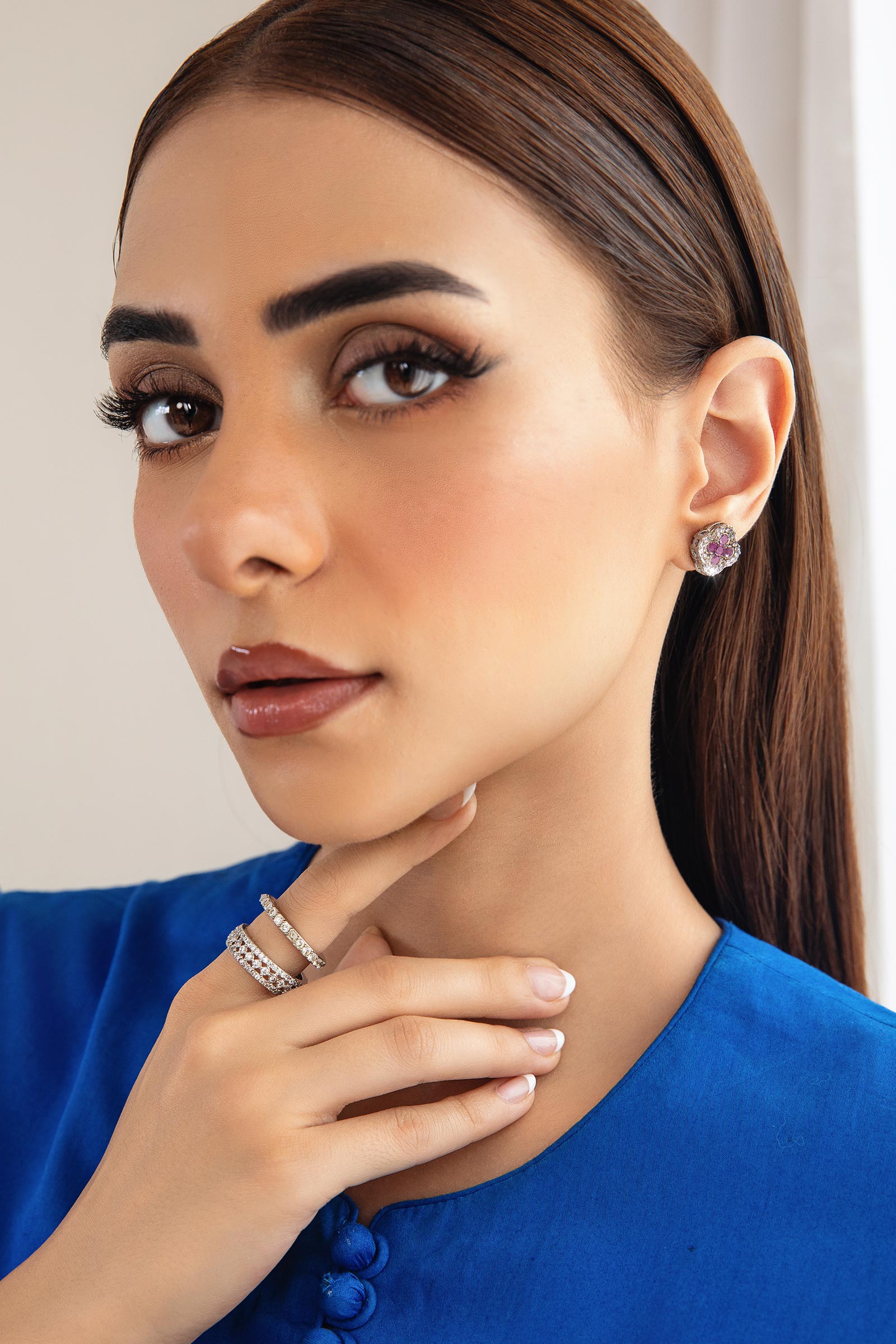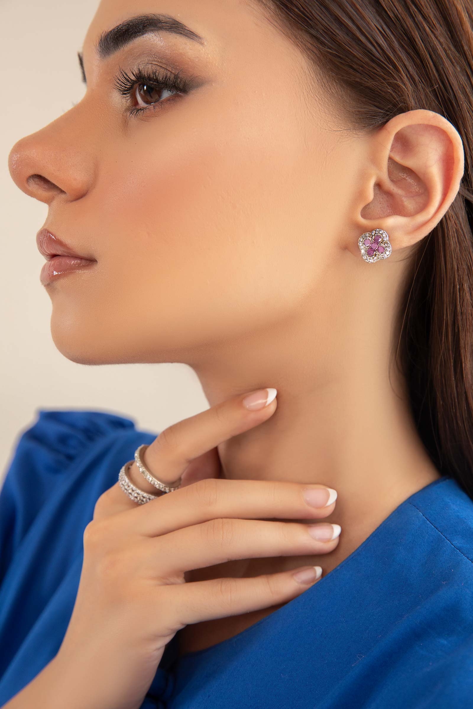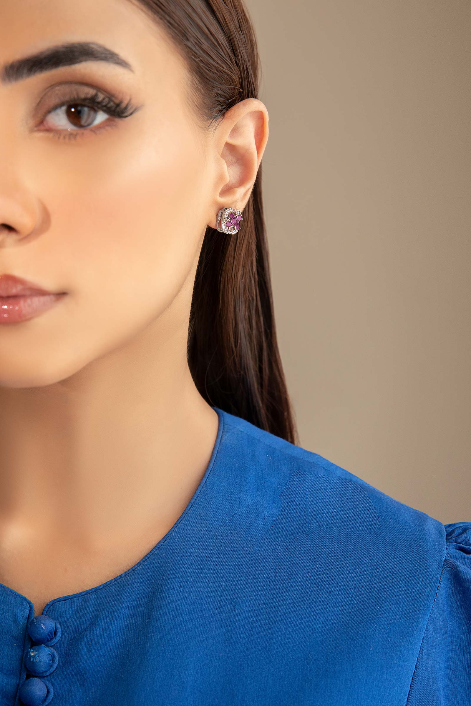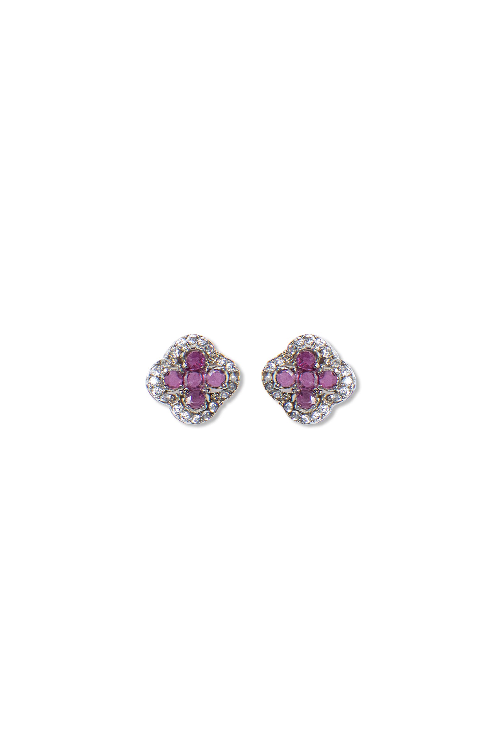 Materials: Zircons Color: Pink Chatham & White Metal: Alloy Finish: Silver Back Pin: Sterling Silver Stud Product Care: Wipe Clean