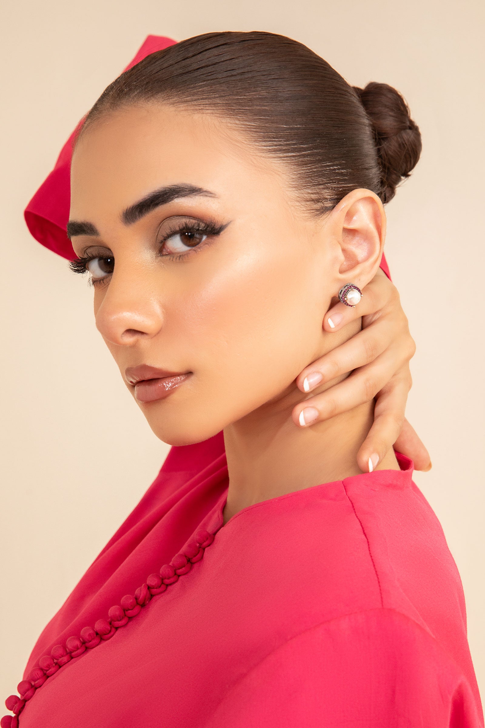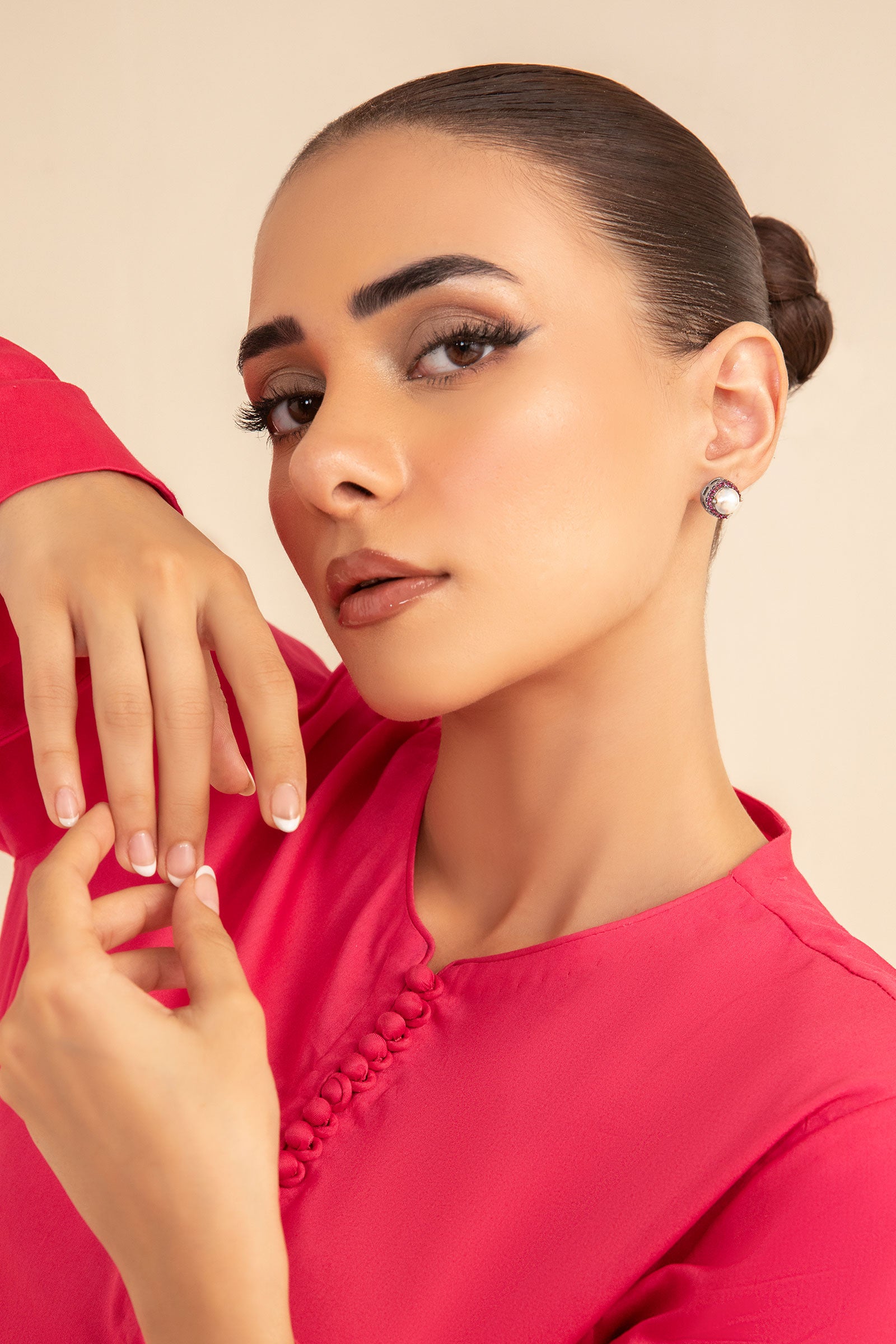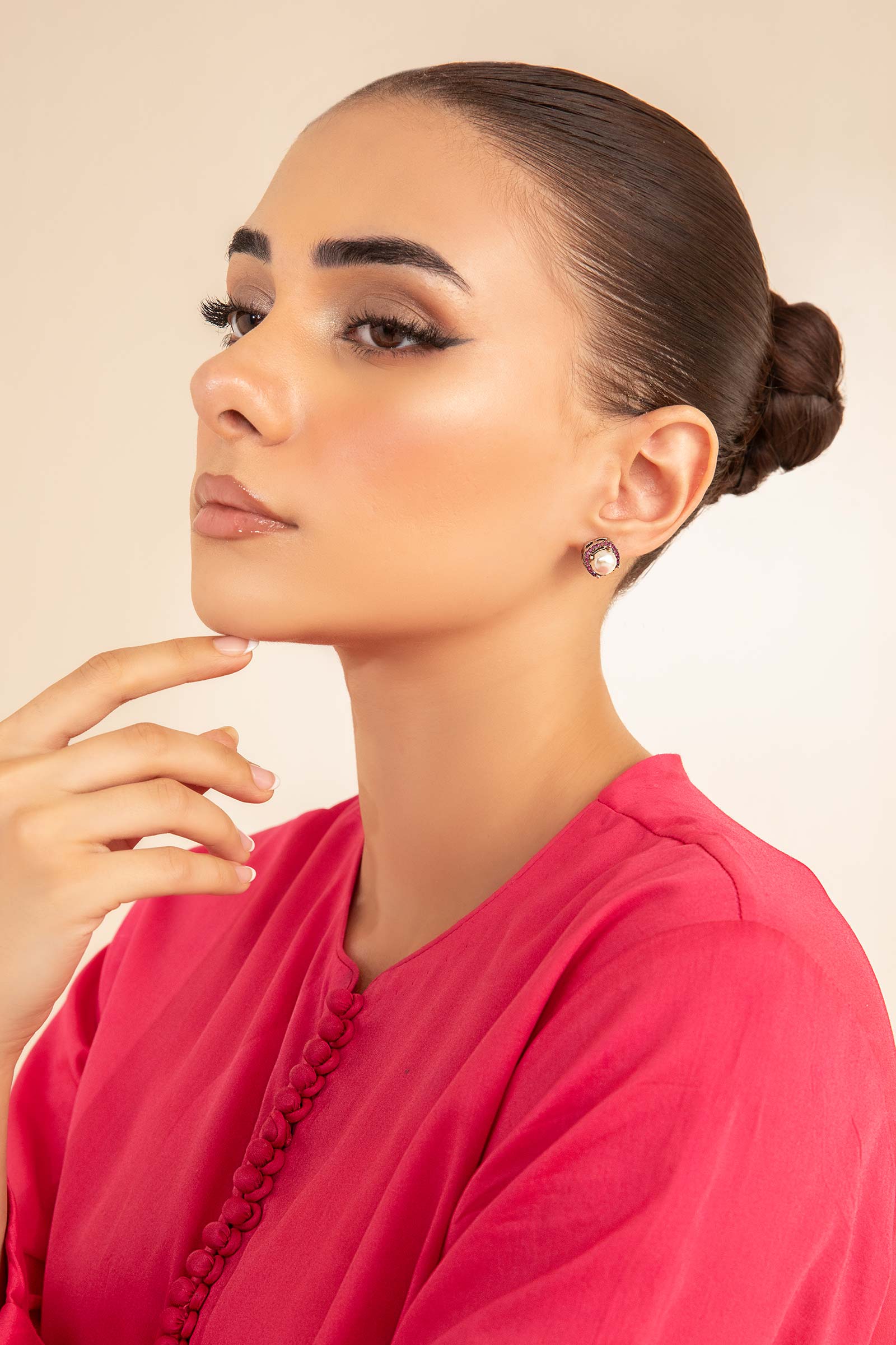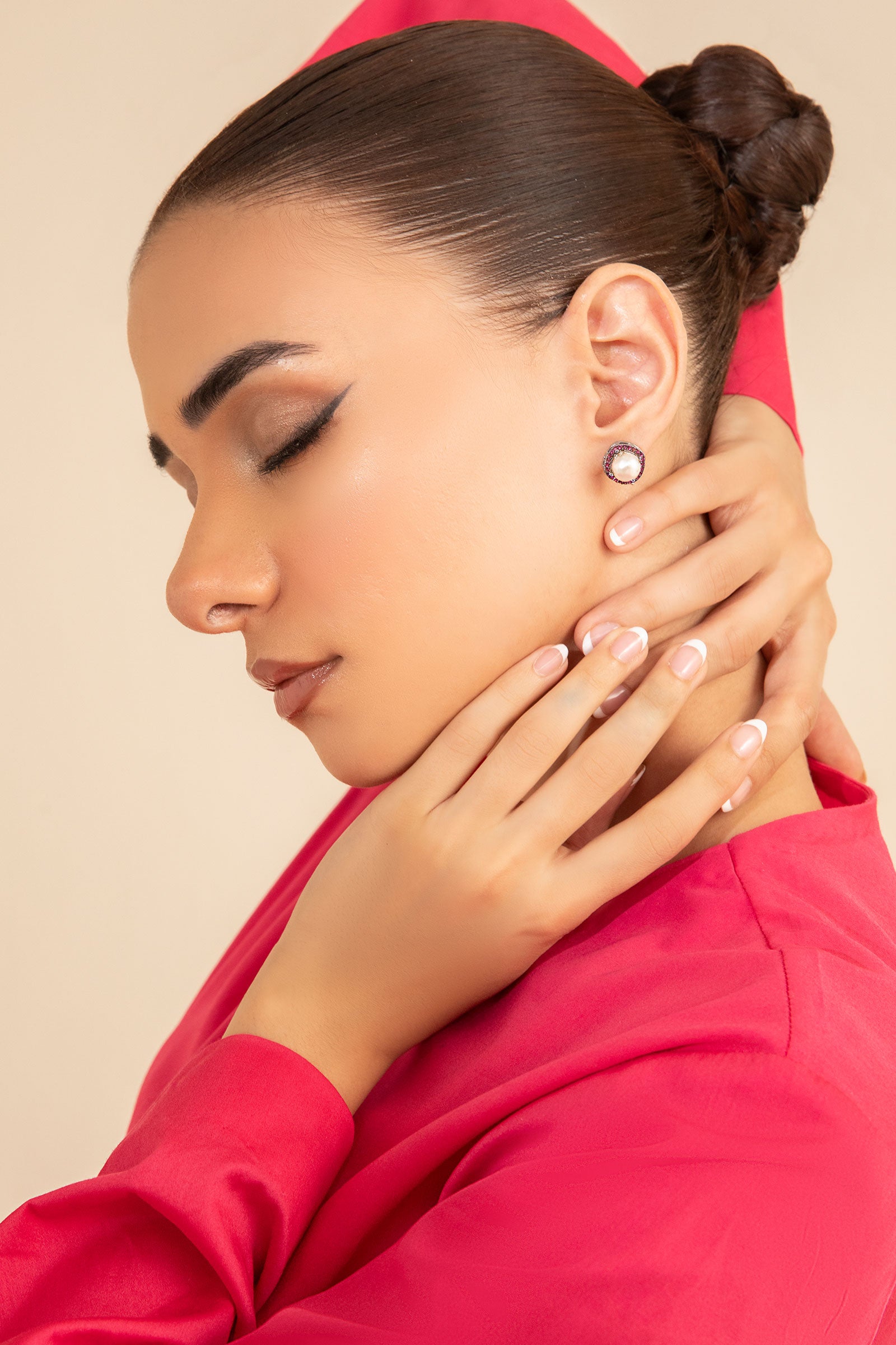 Materials: Zircons & Pearl Color: Pink Chatham & White Metal: Alloy Finish: Silver Back Pin: Sterling Silver Stud Product Care: Wipe Clean