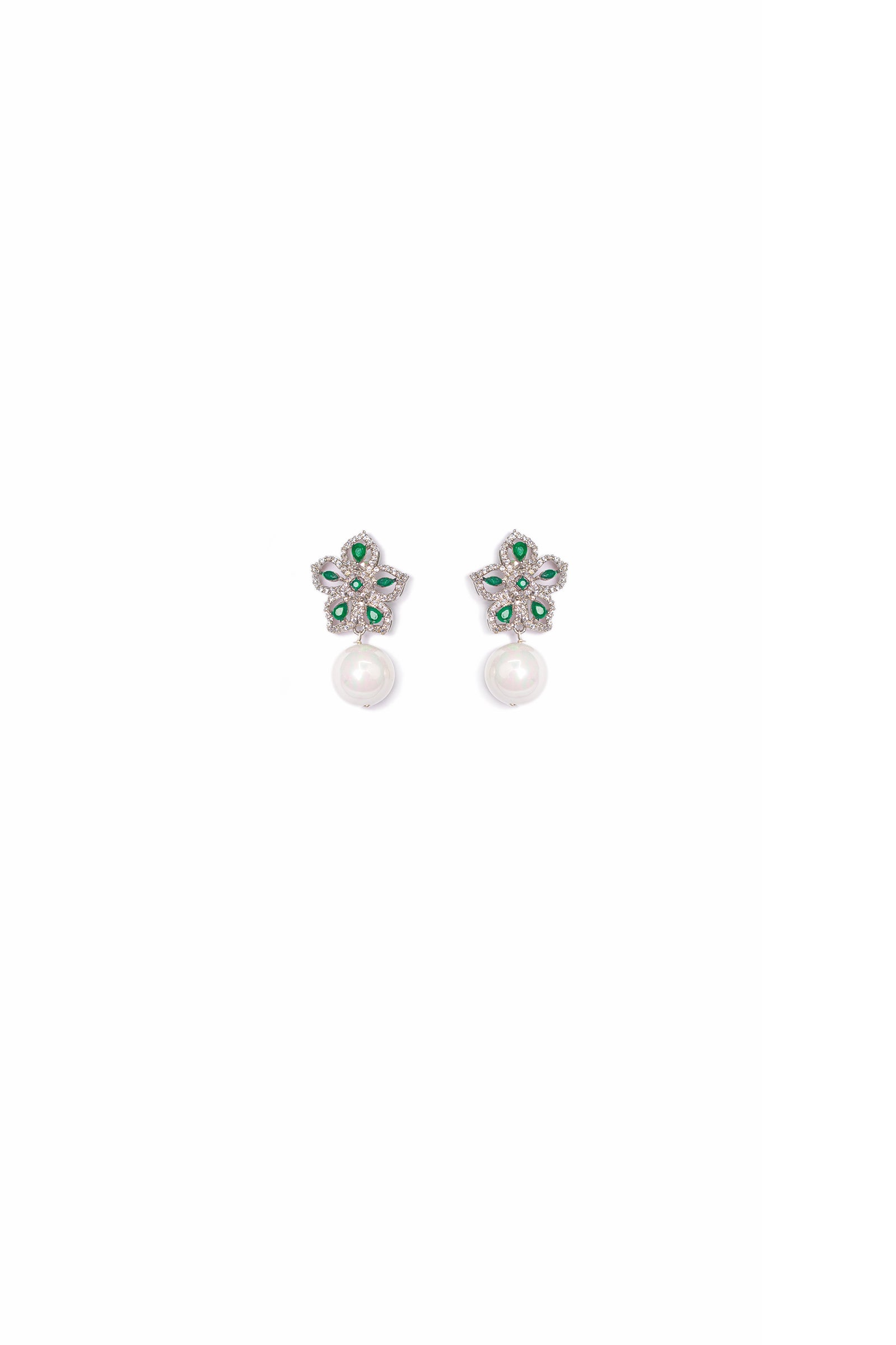 Intricate and opulent, these marvelous floral studs reinterpret grace by showcasing zircon stones intricately surrounding green onyx stones in a delicate flourish design. Culminating with a pearl drop in a silver finish, this design makes sure you shine during your festivities.DetailsMaterial: Alloy MetalFinish: Silver FinishingColor: Green Onyx