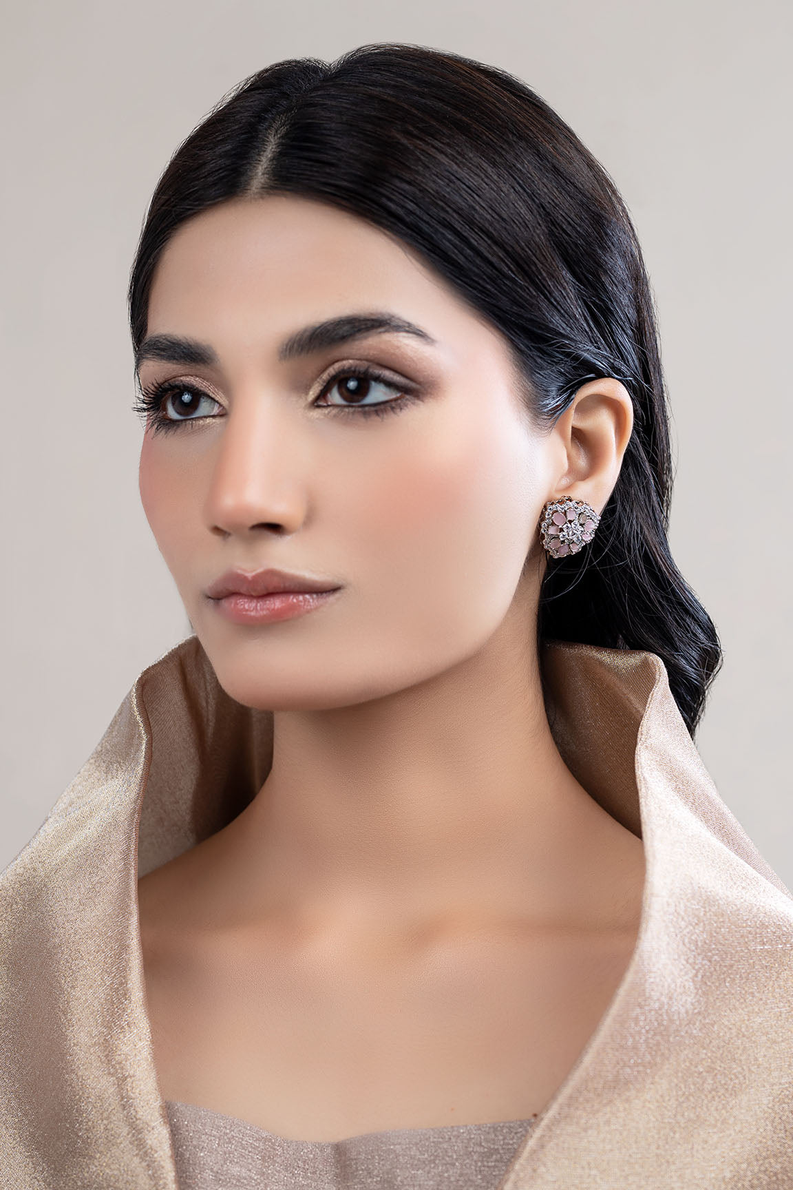 A vision of beauty and elegance; these stud earrings feature soft pink cat's eye stones intricately framed with delicate zircons in a silver finish that sparkle beyond your imagination and let you make a loud statement effortlessly. Details Material: Alloy Metal Finish: Silver Finishing Color: Pink Cat's Eye
