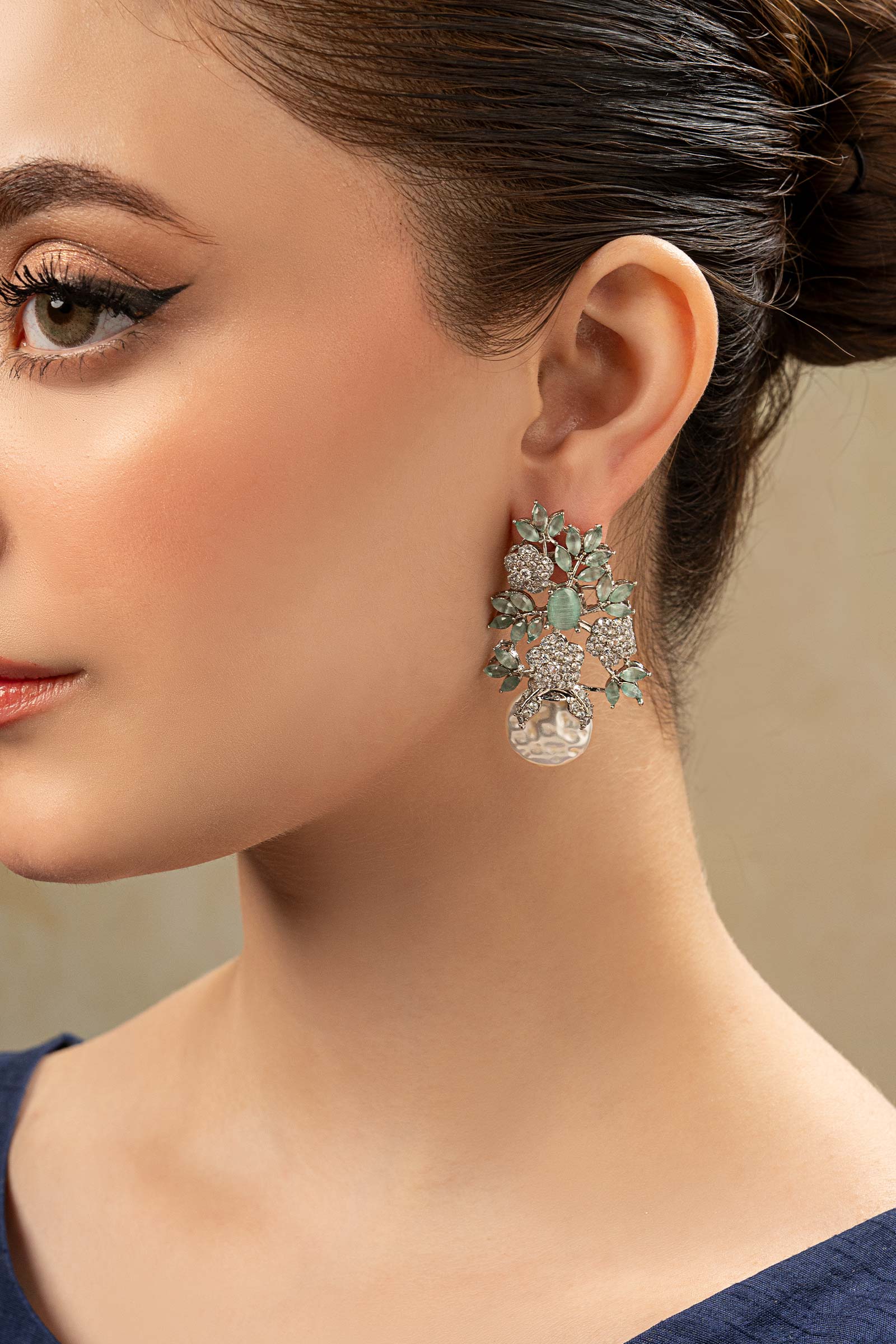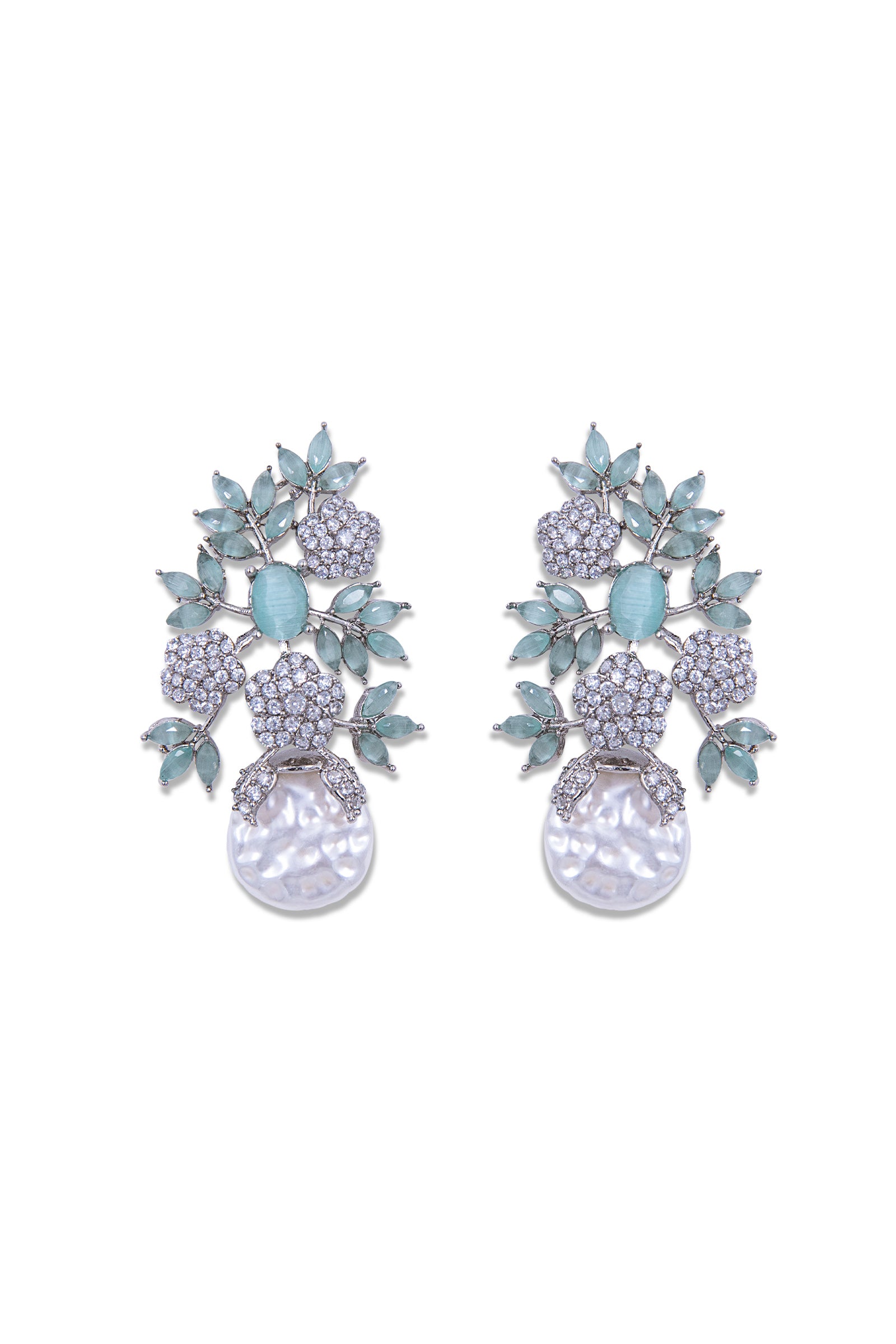 Feel exceptional in our whimsical Ahlam Studs, Featuring delicate florets shimmering with mint green cat's eye stones and white zircons. This masterpiece is finished with a baroque pearl drop, making it a symbol of sophistication and elegance.