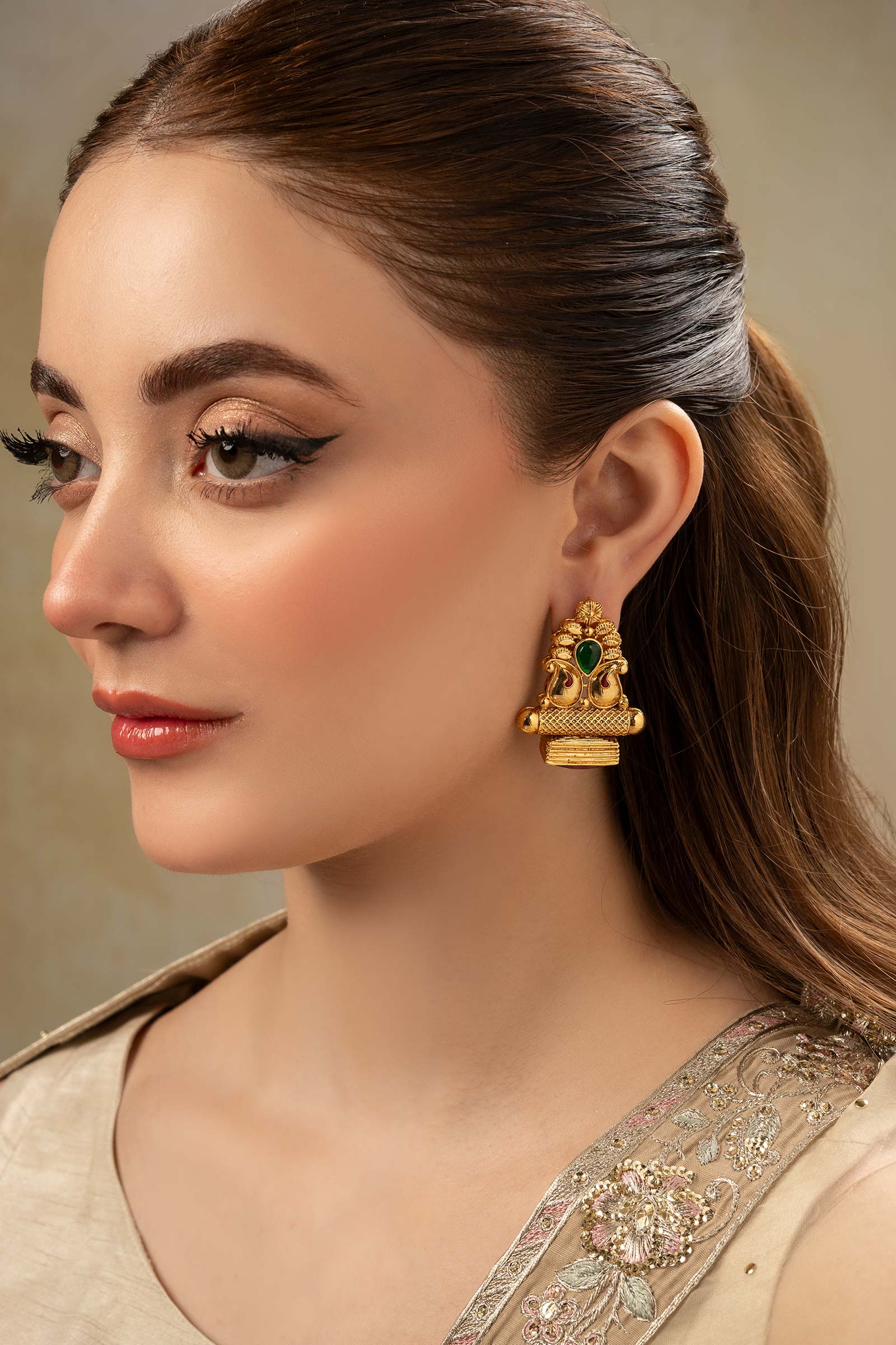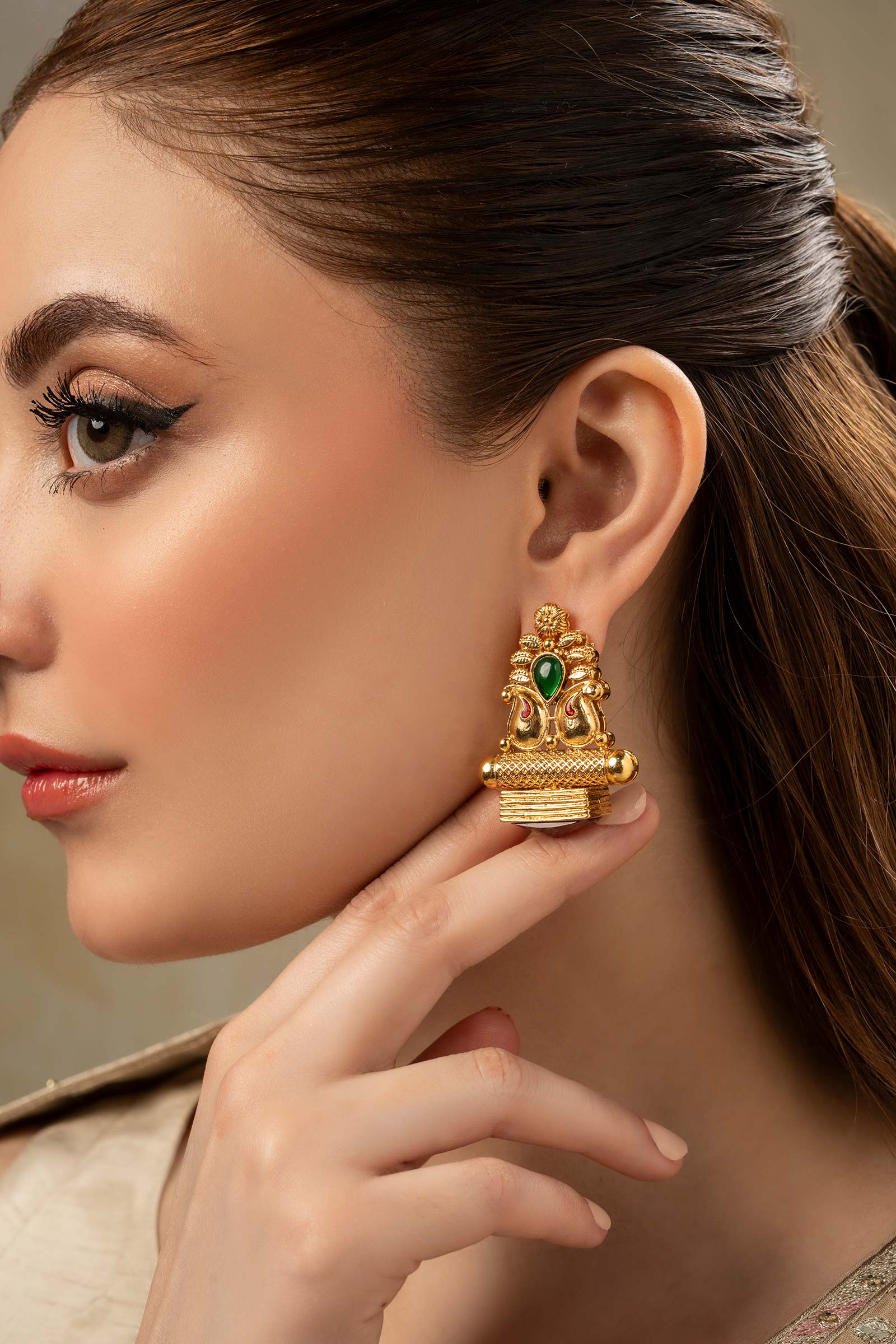 Add a perfect blend of traditional and cultural touch with Egyptian Studs Earrings - Gracefully adorned with green onyx stone in a delicate vintage setting, with a cluster of textures painted in red enamel and finished with a glistening red glass stone, they are an elegant choice for a festive look. Finish: 21K Gold Plated Back Pin: Sterling Silver Stud Product Care: Wipe Clean