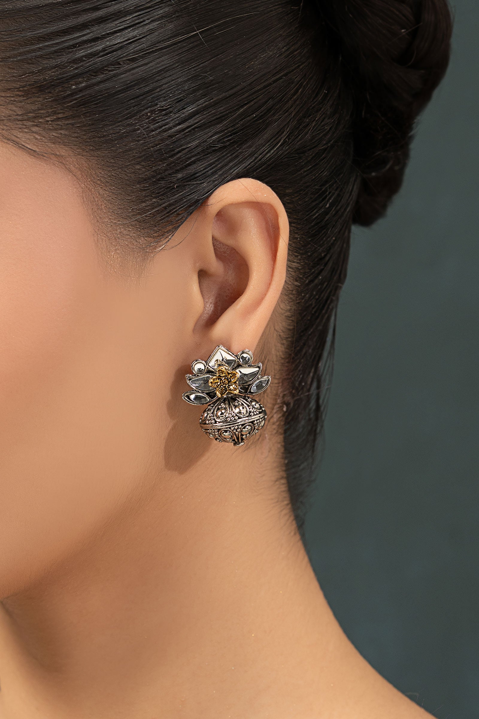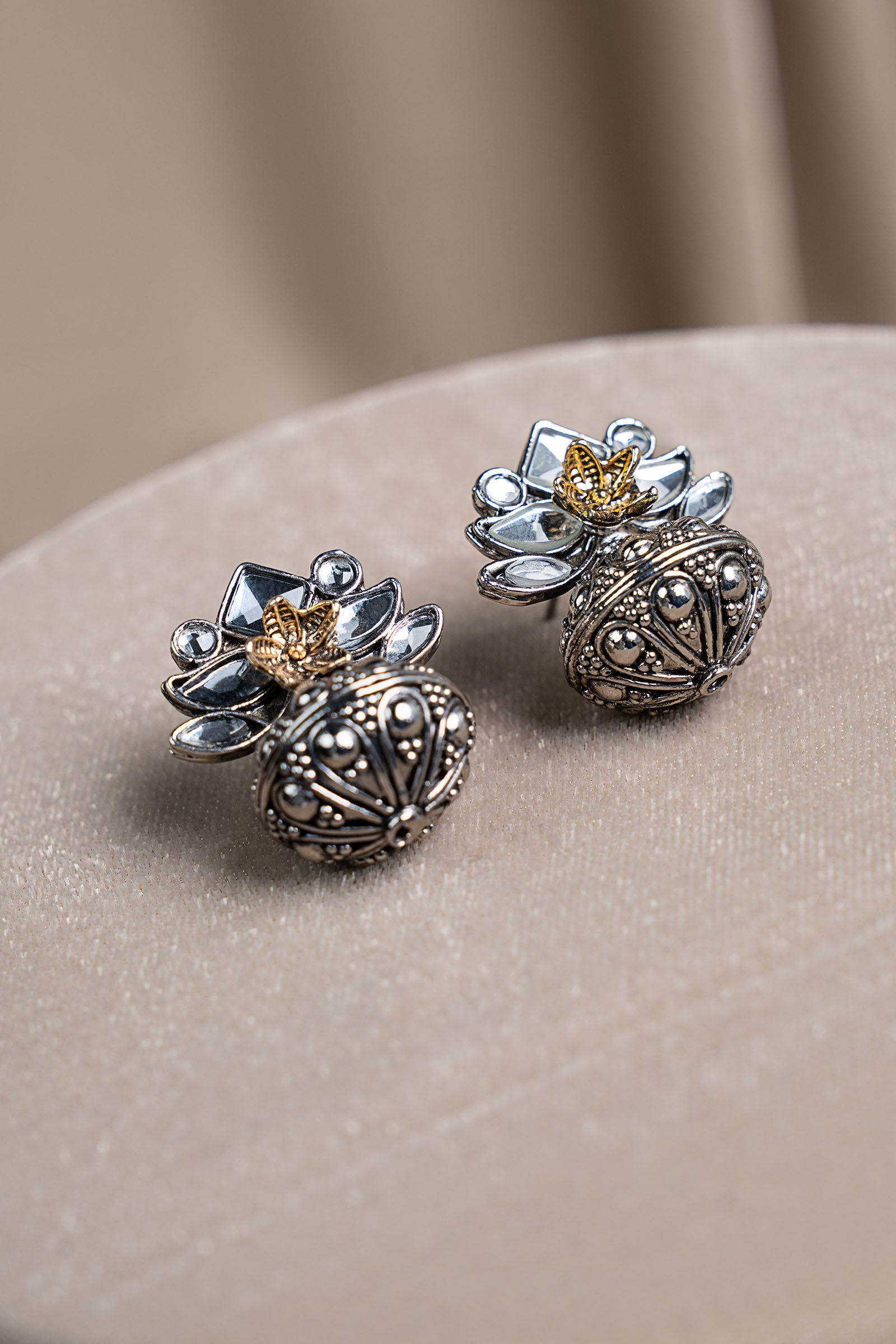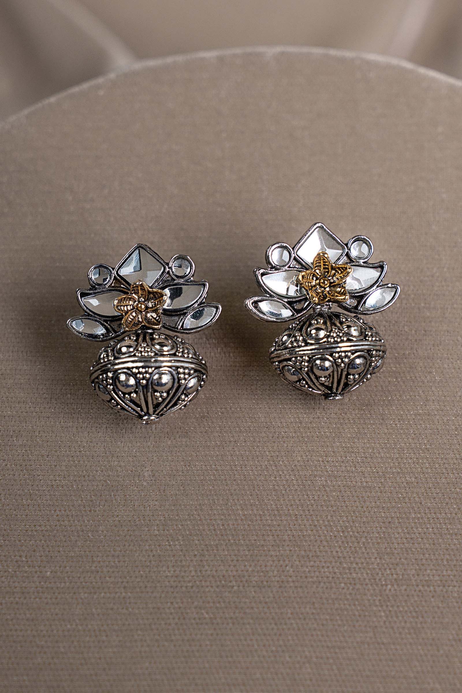 Delicate yet distinctive, these floral-dome stud earrings bloom with white hand-cut glass at their heart, catching light with a soft, effortless glow. The intricately textured dome adds depth and character, echoing artisanal craftsmanship in every curve. Designed to elevate the everyday, they bring a quiet poetry to your look - subtle, graceful, and beautifully timeless. Composition: Ganga Jamni Back Pin: Sterling Silver Stud Care Instructions: Wipe Clean