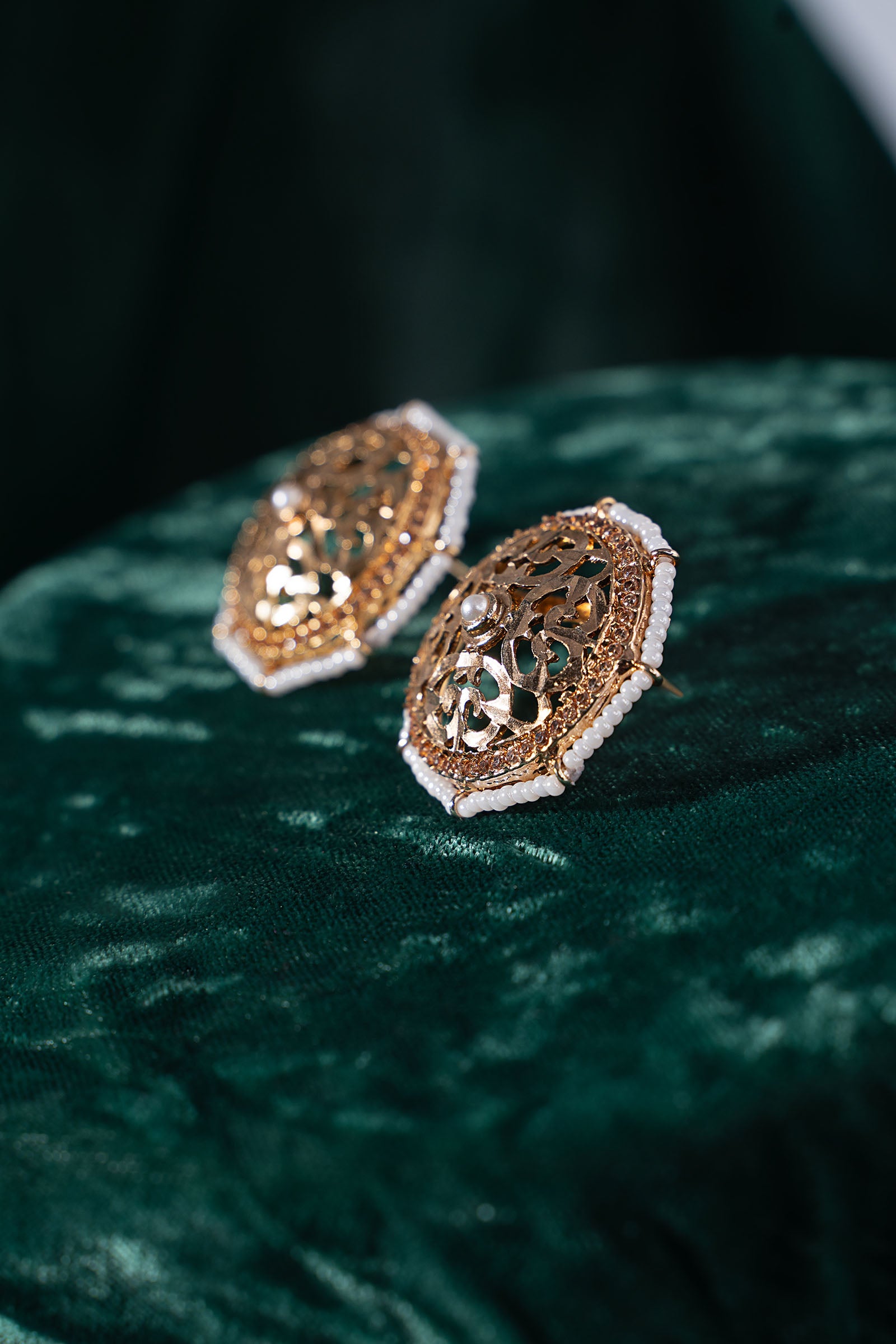 A masterpiece of desi artistry, this intricately crafted metalwork studs cradles a lustrous white pearl at its heart, encaged in a halo of sparkling champagne zircons. Delicate indian poth piroi traces the edges, adding heritage charm and rhythmic movement. Poetic and timeless, it elevates every gesture with a quiet grandeur - where classic craftsmanship meets modern elegance.