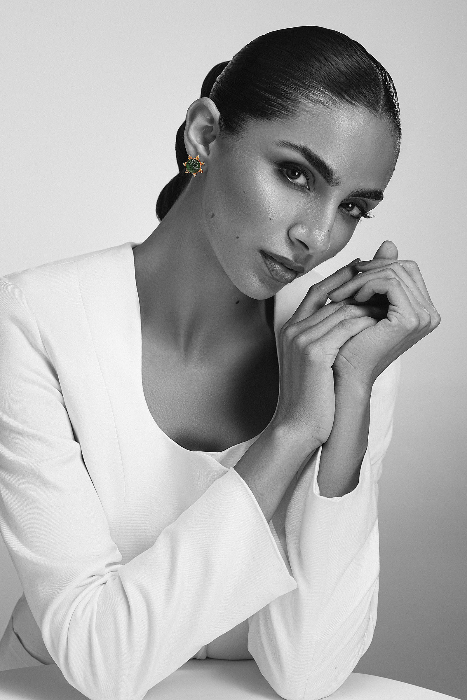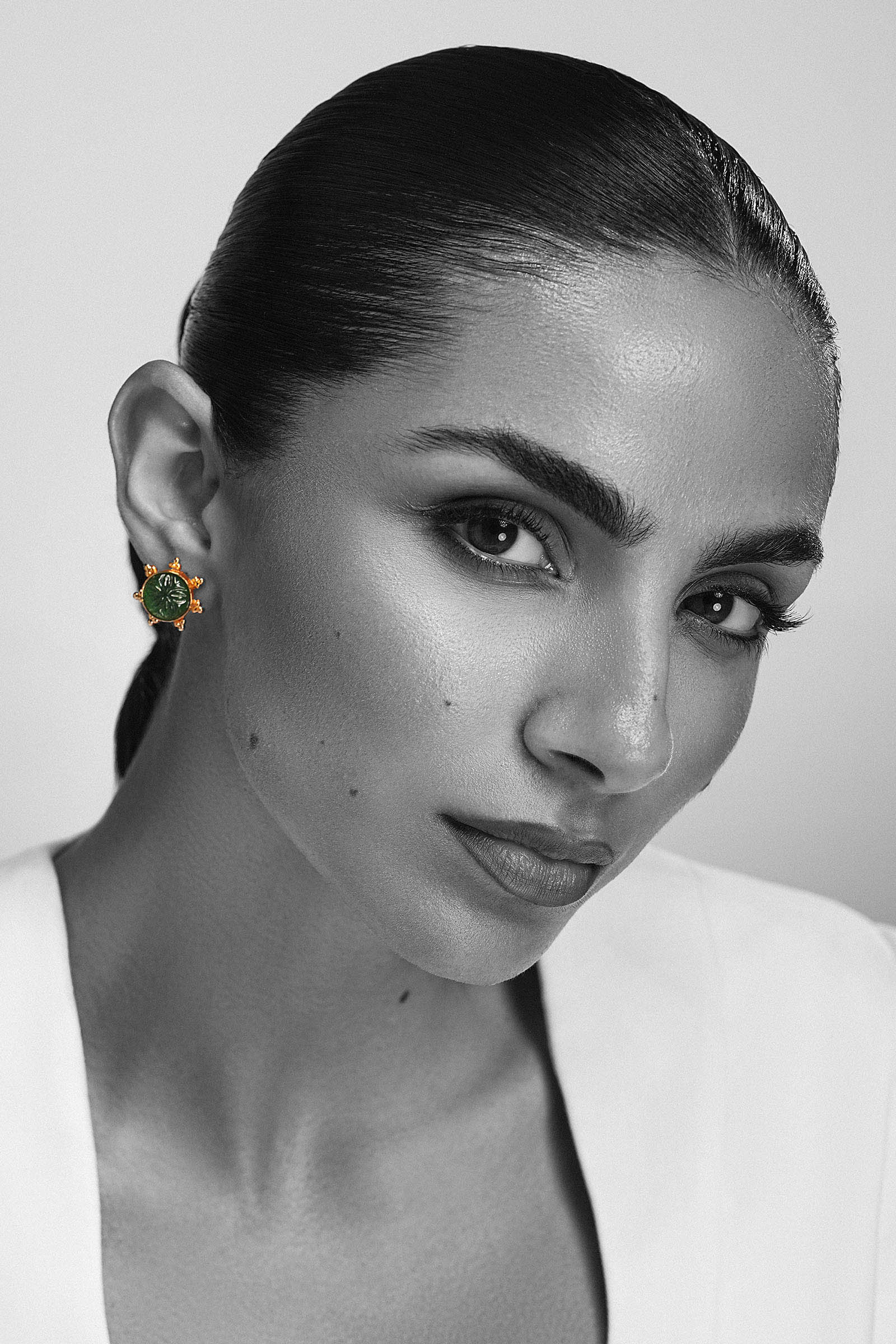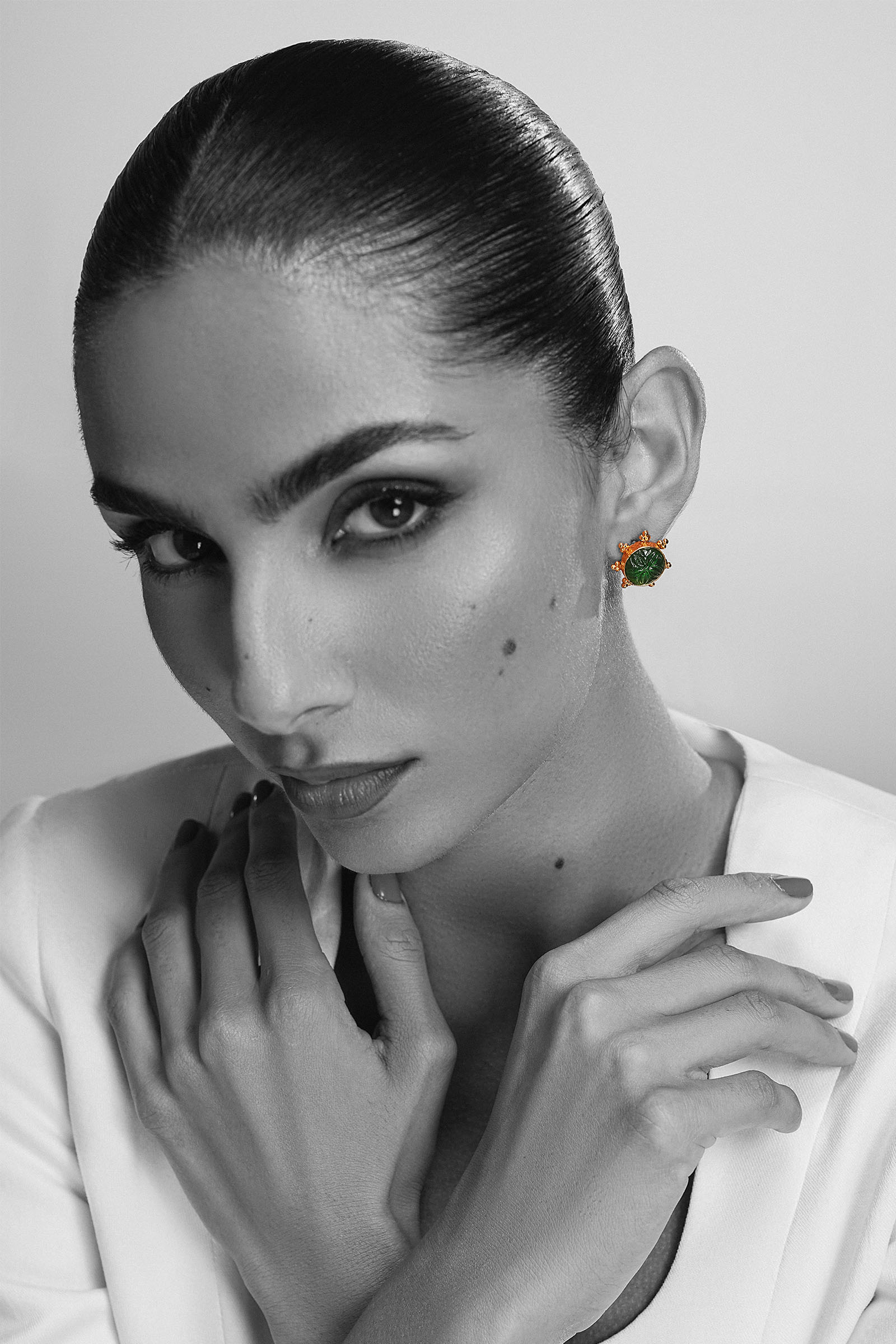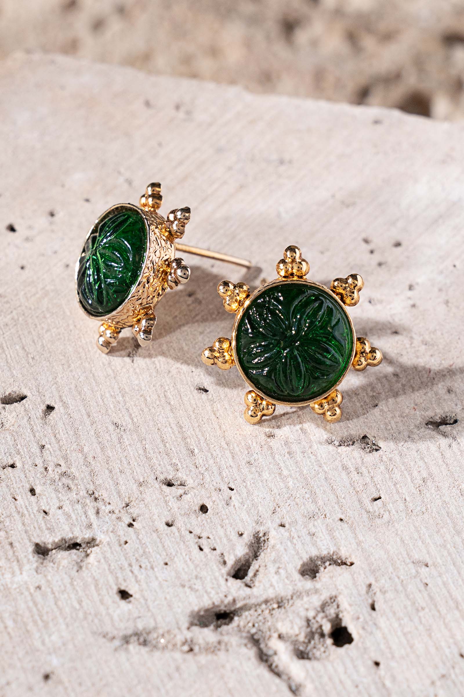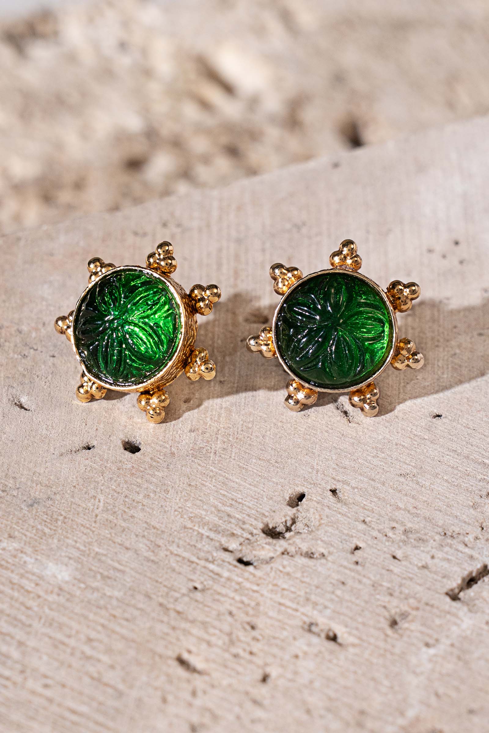 Where modern design meets poetic charm, our Demir Stud Earrings shimmer with the enigmatic allure of delicately carved green stone. Set within an intricate, round-shaped textured metal cage with delicate cutwork surrounding the frame, they transform classic silhouettes into a statement of romance and sophistication - perfect for the woman who cherishes beauty in every detail. Composition: 21K Gold Plated Back Pin: Sterling Silver Stud Care Instructions: Wipe Clean
