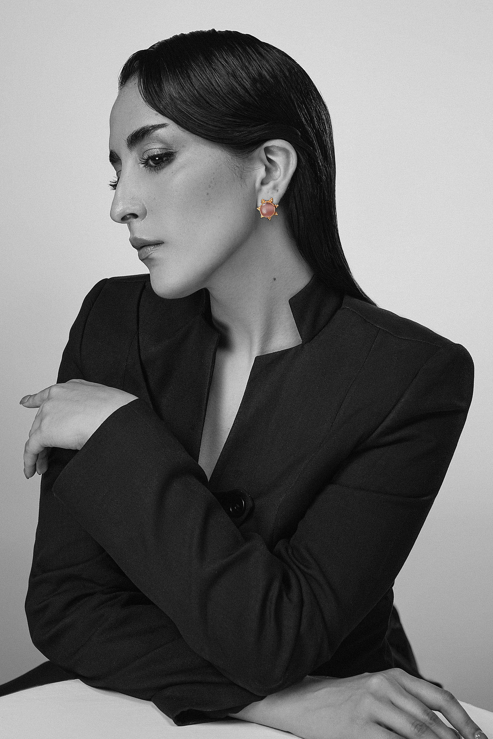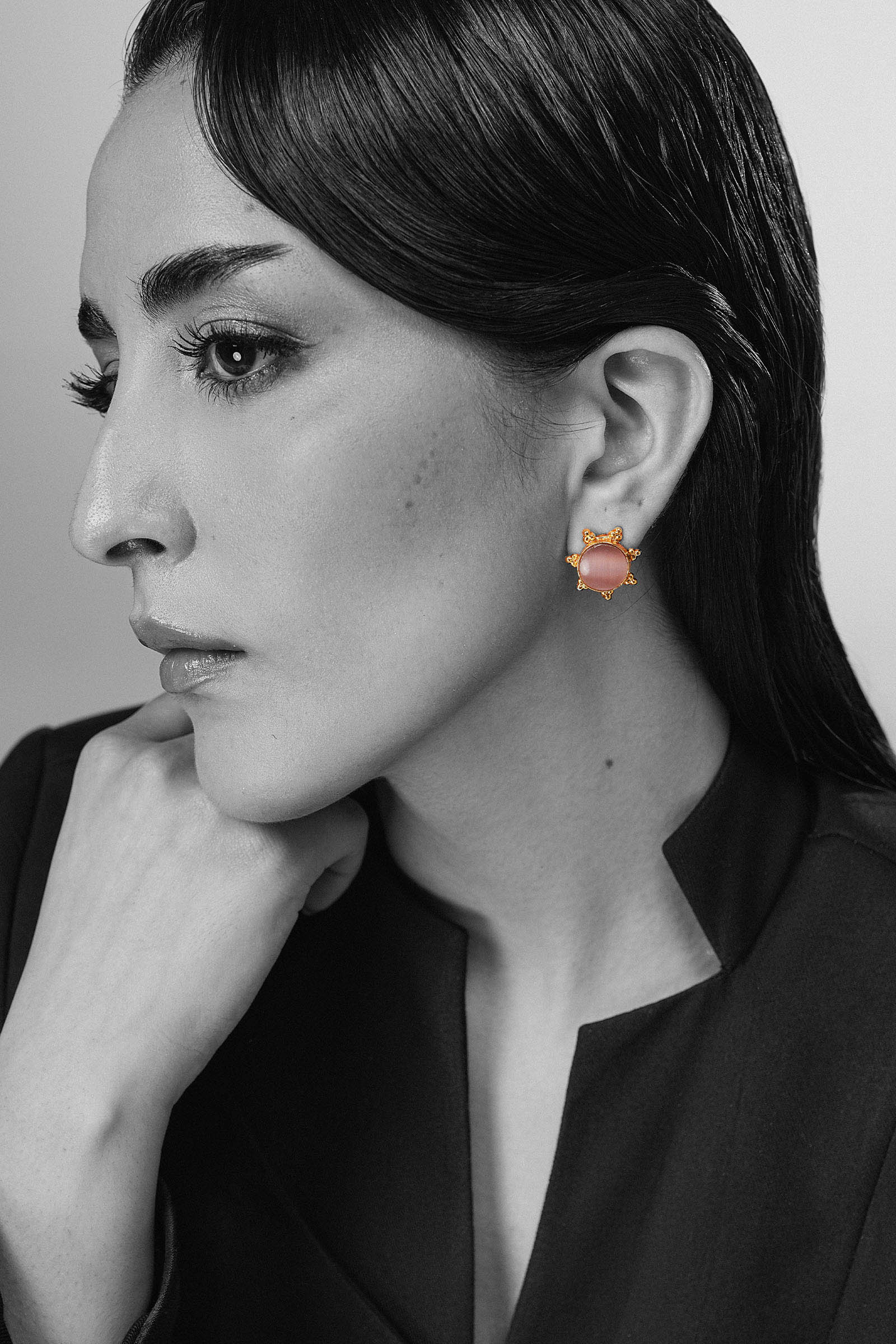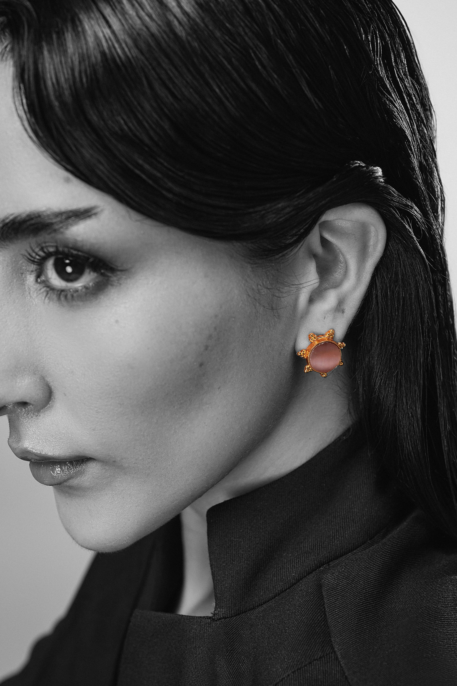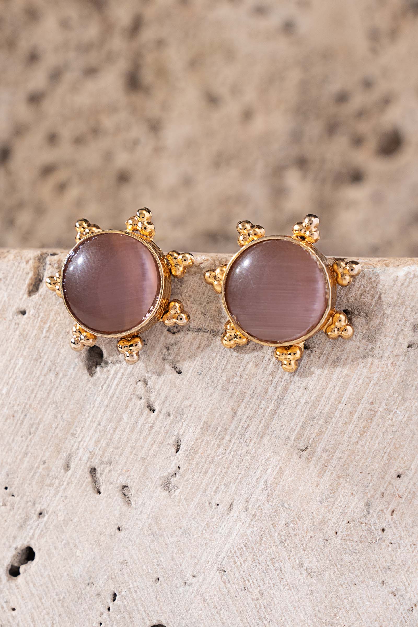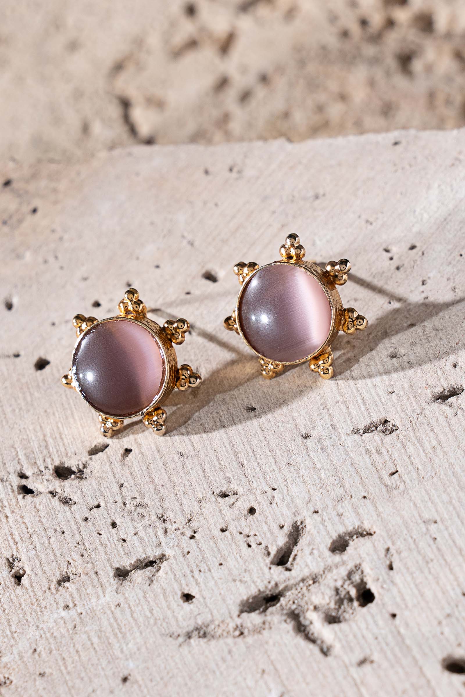 Where modern design meets poetic charm, our Demir Stud Earrings shimmer with the enigmatic allure of purple cat’s eye stone. Set within an intricate, round-shaped textured metal cage with delicate cutwork surrounding the frame, they transform classic silhouettes into a statement of romance and sophistication - perfect for the woman who cherishes beauty in every detail. Composition: 21K Gold Plated Back Pin: Sterling Silver Stud Care Instructions: Wipe Clean