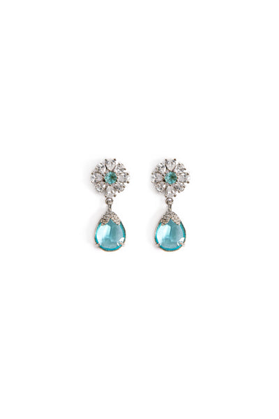 These stud earrings in glass cut teal blue stone, surrounded by white zircons, complete the flower look by creating a contrast with the blue stone. The hanging drop-shape stone, adds a touch of elegance and movement with two small leaf motifs giving a statement look. The earrings are silver-plated and come with a sterling silver stud back. Perfect choice for floral and graceful jewellery lovers.