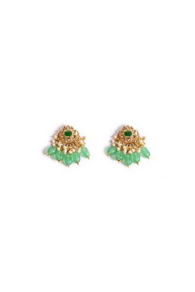 These stunning earrings featuring kanwal and chand motifs are inspired by the beauty of the moon and lotus flowers with hand-cut glass stones, hanging pearl pyroi with jade green onyx stones that add a touch of elegance. The 21k gold plated gets you a luxurious shine to make you stand out on any occasion.