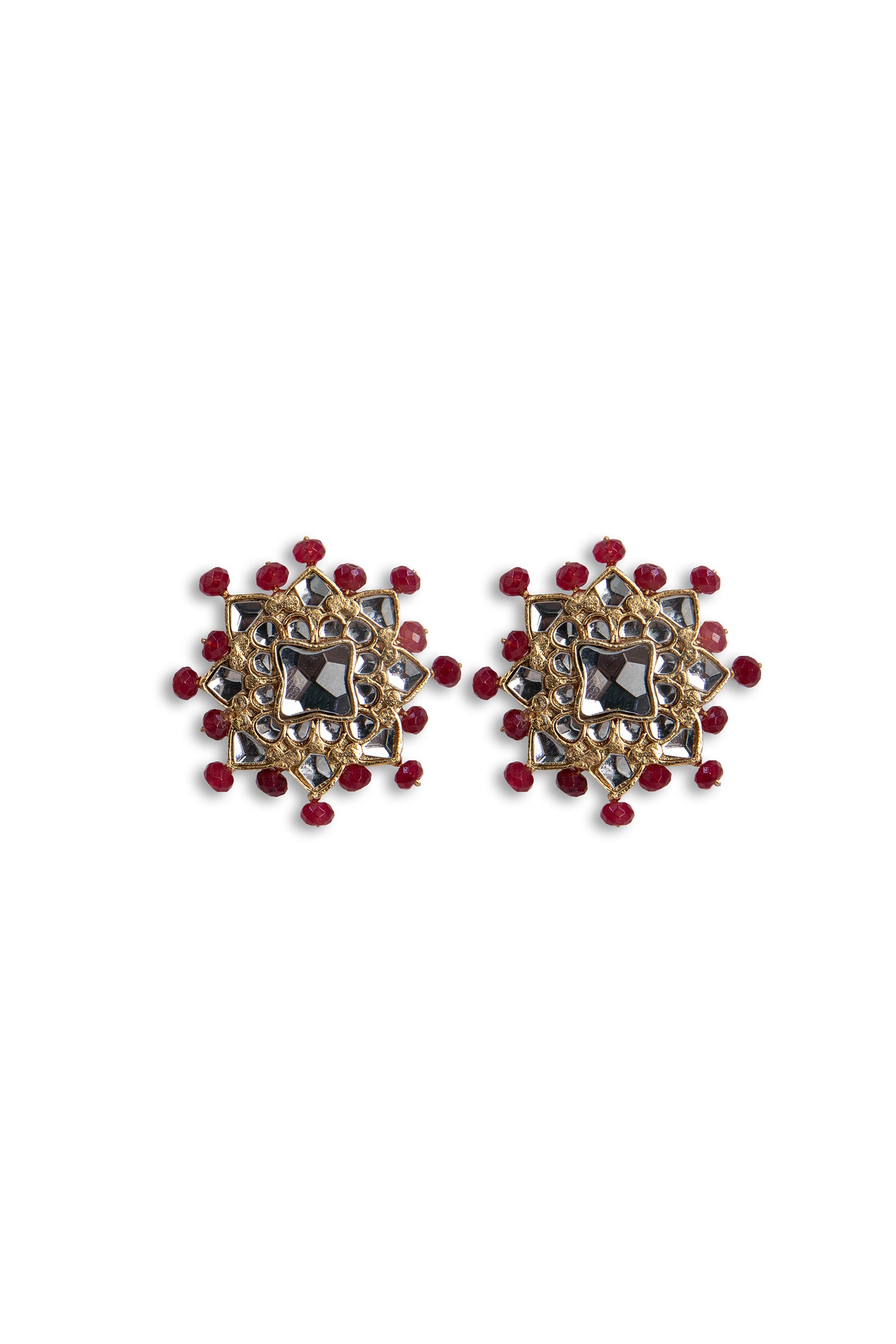 Materials: Onyx, Handcut Glass Color: Dark Pink Onyx & White Metal: Alloy Finish: 21k Gold Plated Back Pin: Sterling Silver Stud Product Care: Wipe Clean