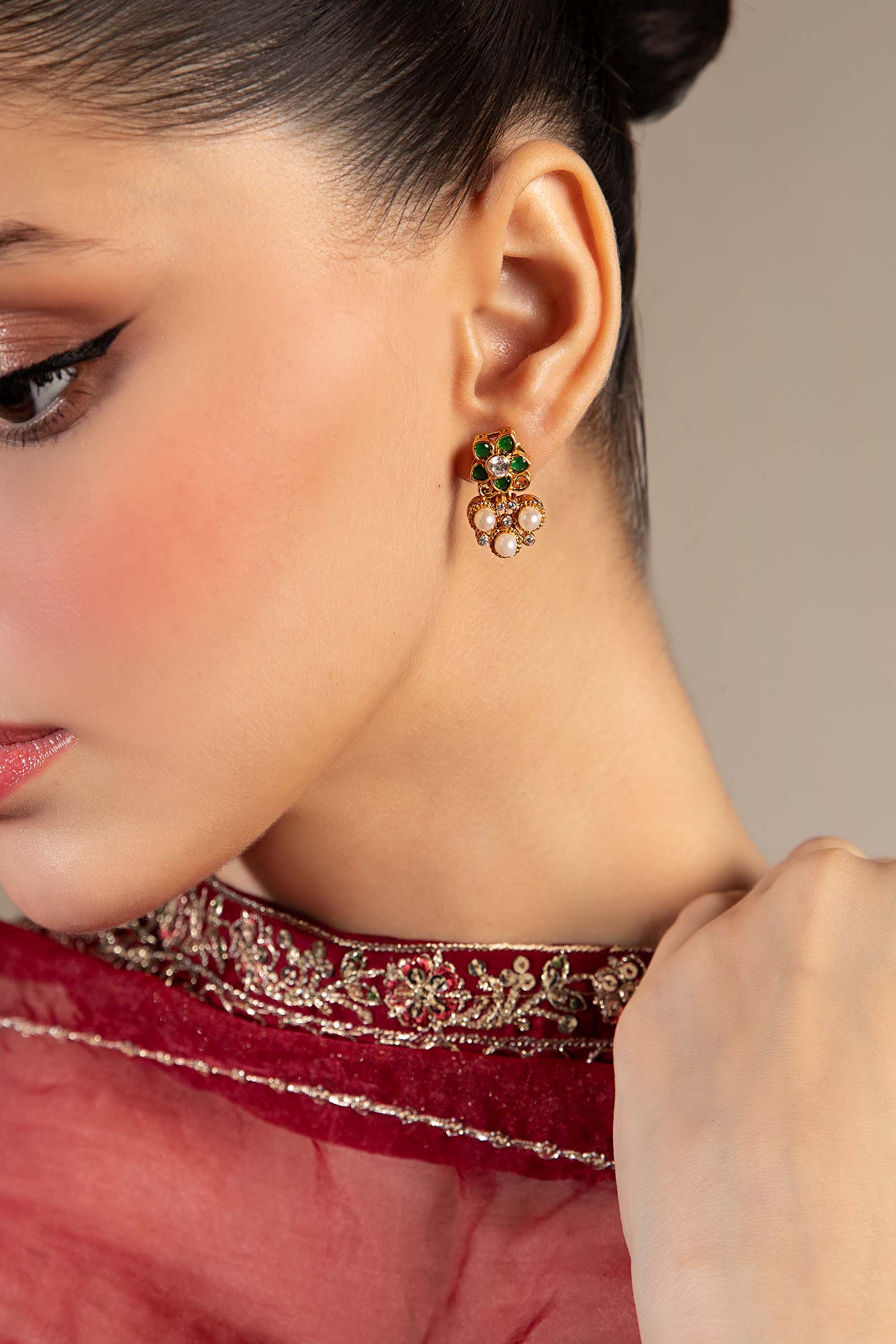 Materials: Onyx, Zircons & pearls Color: Green Onyx & White Metal: Alloy Finish: 21k Gold Plated Back Pin: Sterling Silver Stud Product Care: Wipe Clean