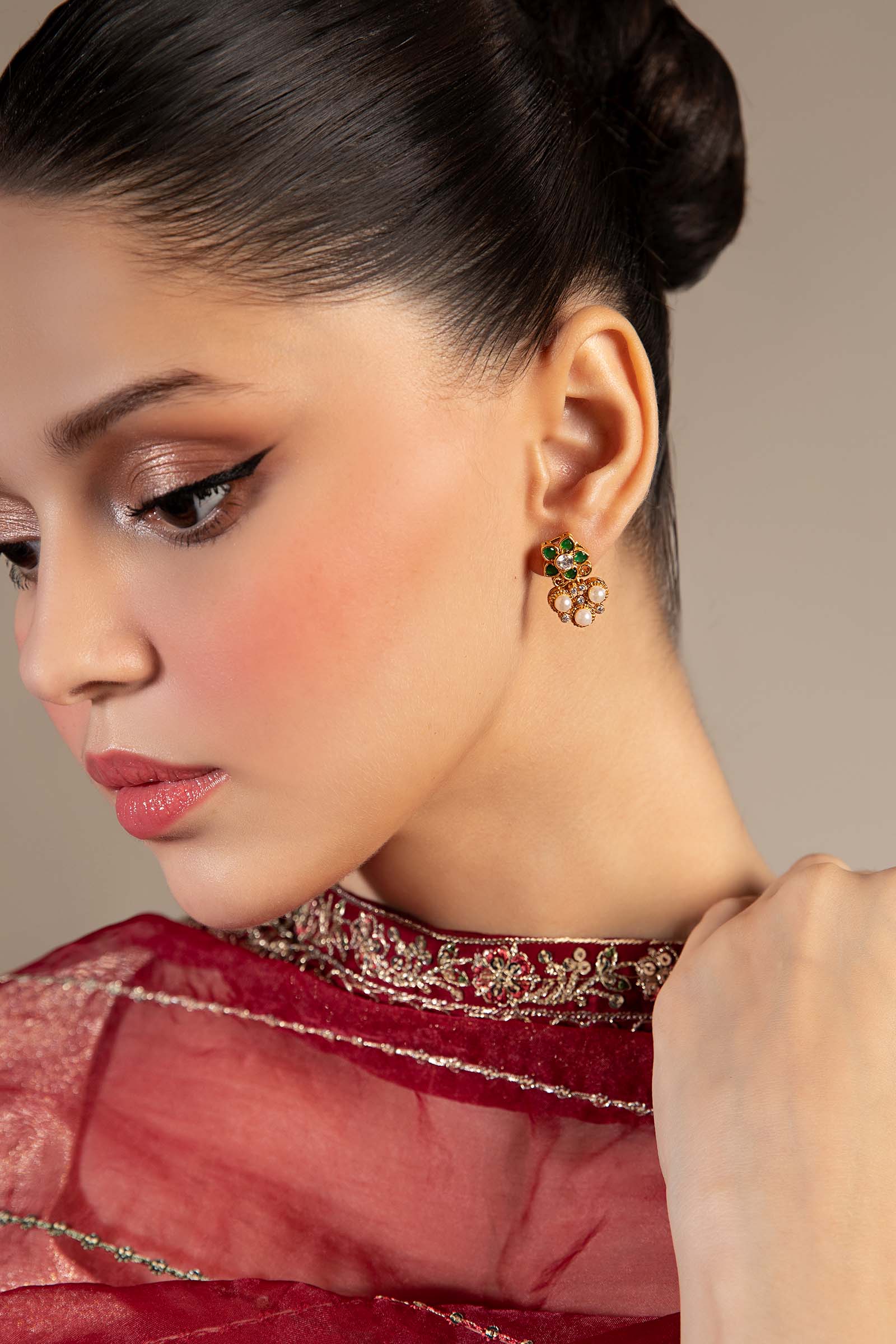 Materials: Onyx, Zircons & pearls Color: Green Onyx & White Metal: Alloy Finish: 21k Gold Plated Back Pin: Sterling Silver Stud Product Care: Wipe Clean