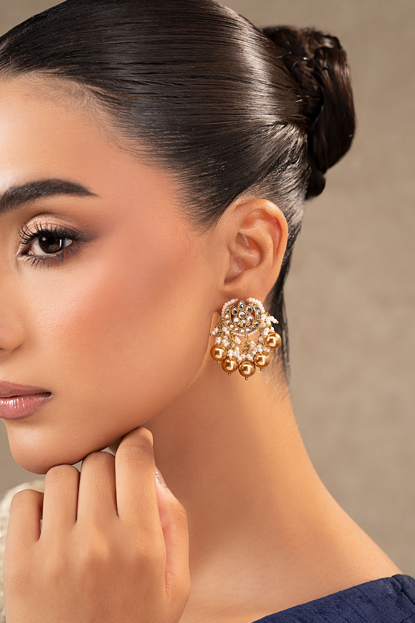 With their elaborate Indian poth design and exquisite white handcut glass, these magnificent studs are a timeless tribute to heritage. Featuring elegant gold pearl pyroi embellishments, they tell a poetic story of timeless elegance and royal celebration, designed to add timeless beauty and tradition to your ensemble. Finish: 21K Gold Plated Back Pin: Sterling Silver Stud Product Care: Wipe Clean