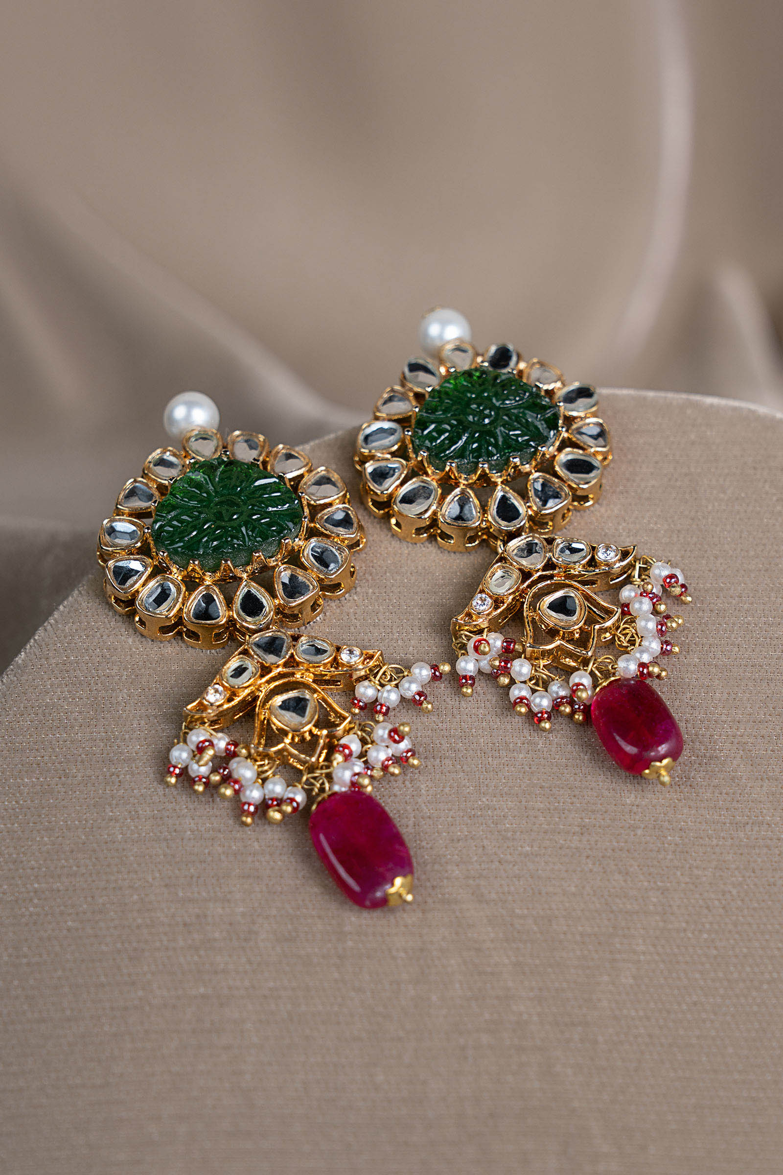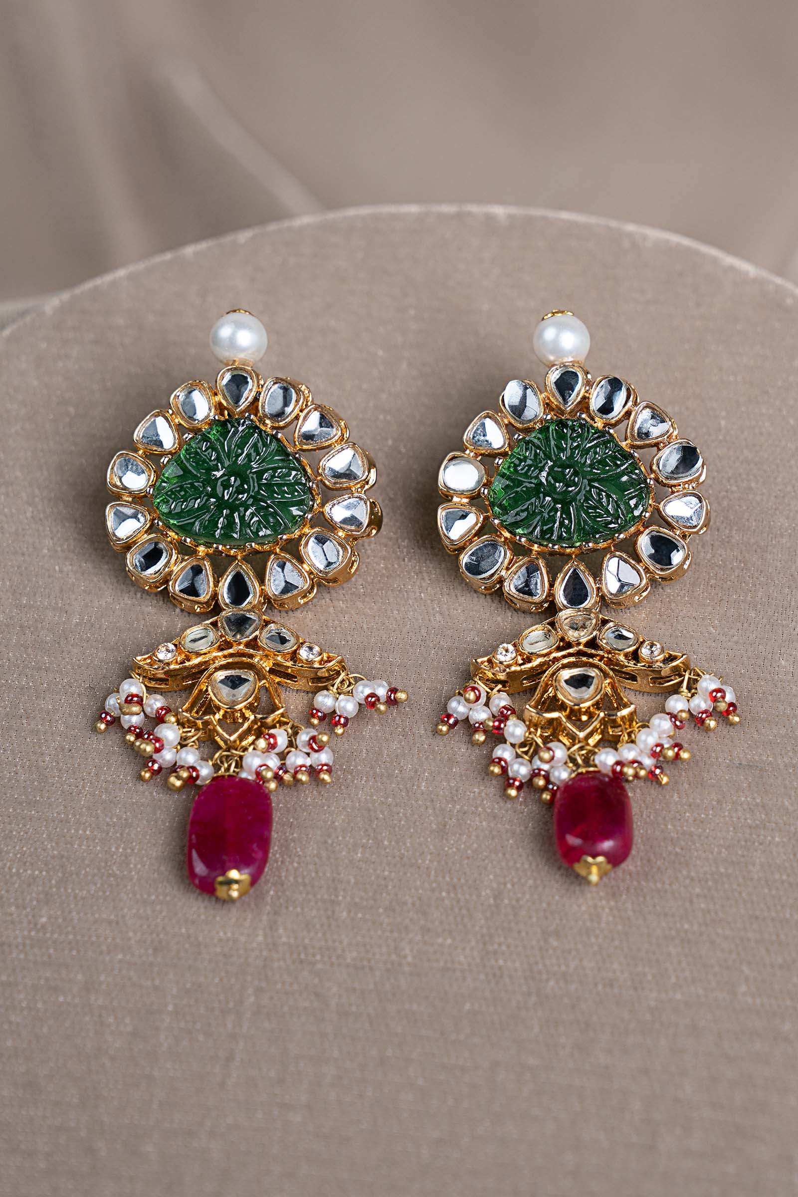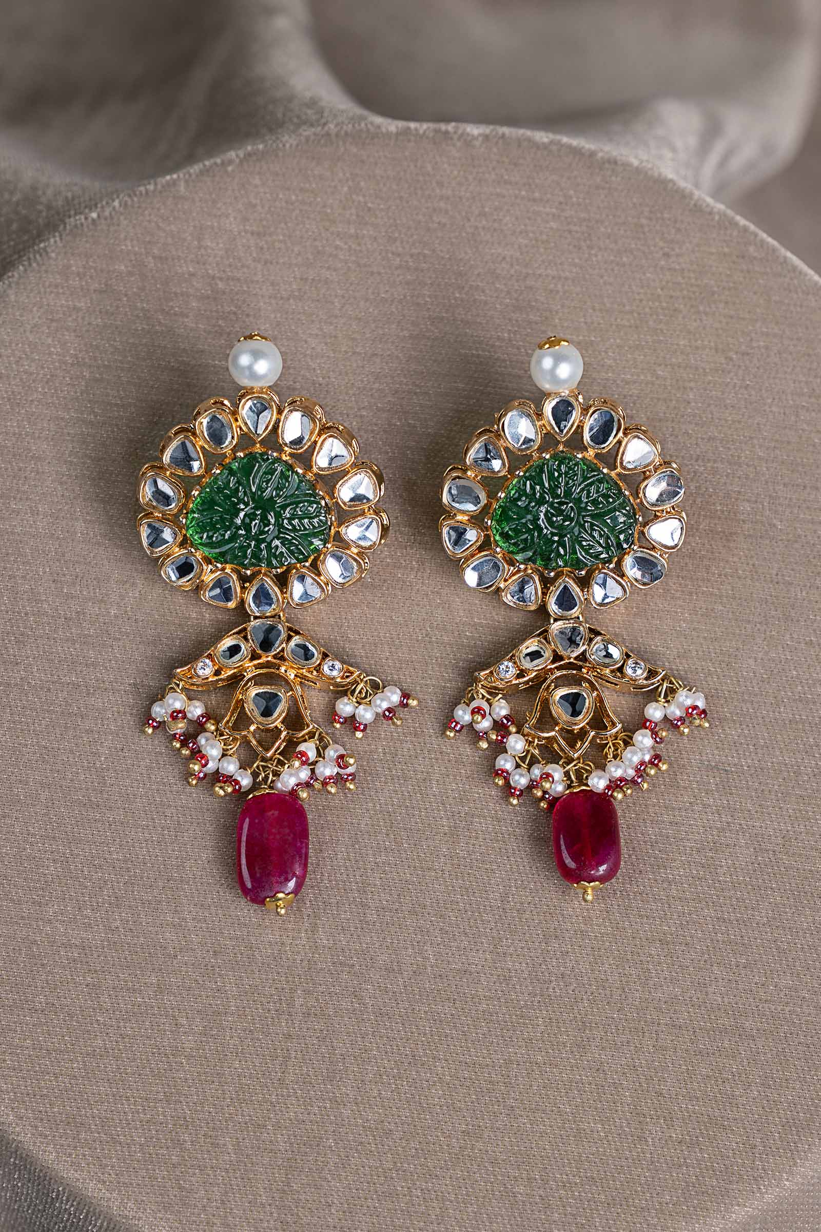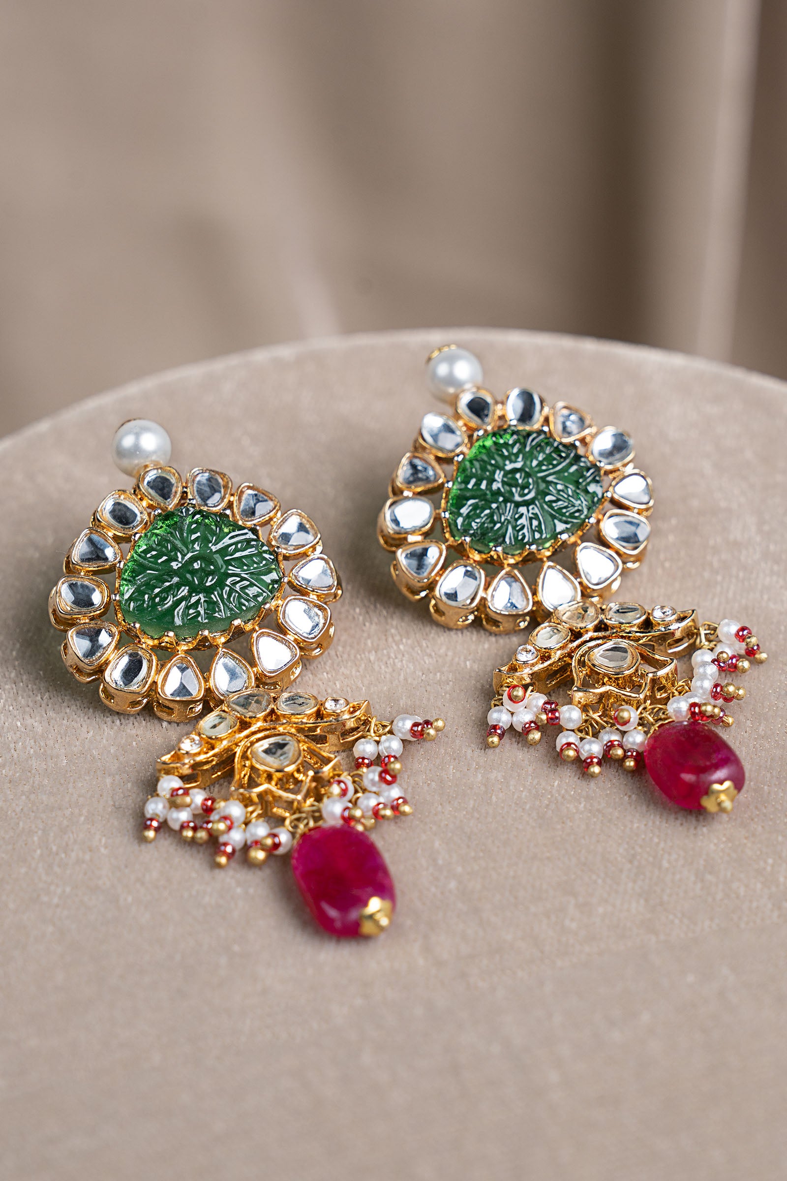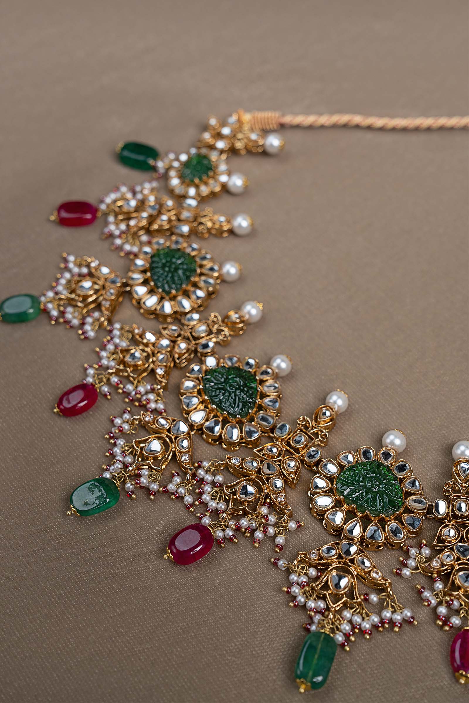 A celebration of sacred geometry and timeless romance, this wedding set unfolds in radiant white hand-cut glass motifs, sculpted into graceful geometric harmony. At its heart rests a beautifully carved green stone, anchoring the design in regal tradition. Cascading green and deep pink hanging stones add festive rhythm, while delicate pearl piroi accented with soft pink poth lends a whisper of classic elegance. Finished in a traditional dori-style tie, this set is a poetic union of heritage artistry and ceremonial grandeur - crafted for wedding festivities and an unforgettable, heirloom-worthy look.