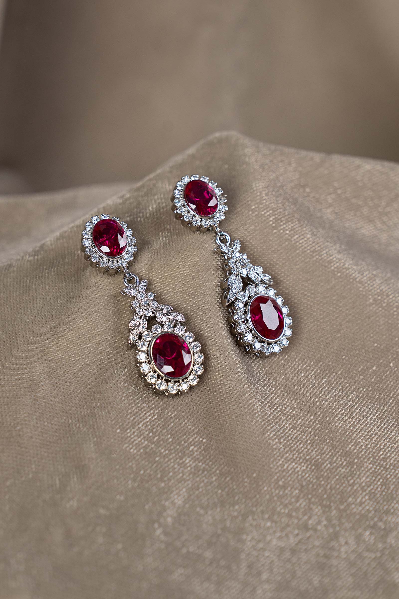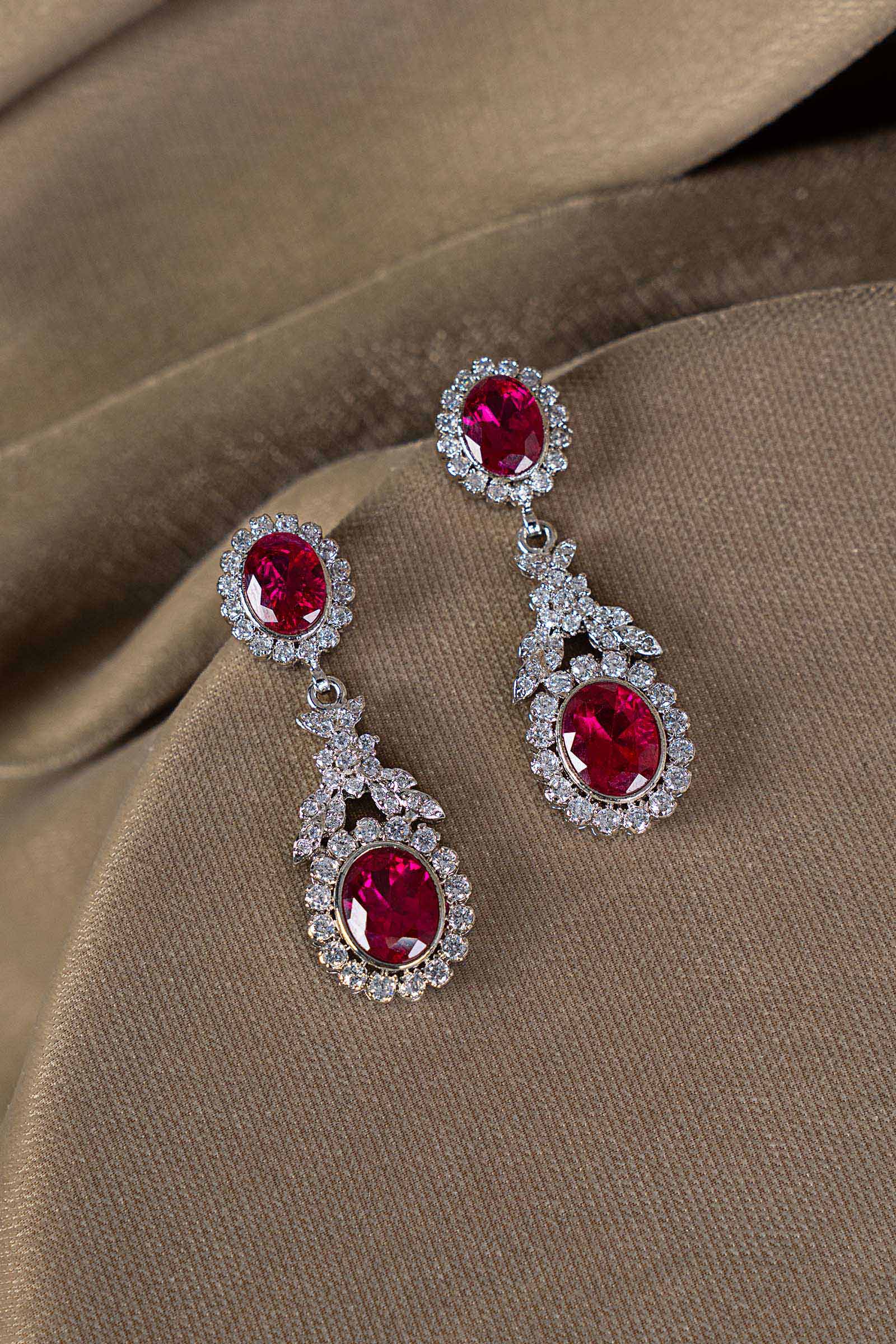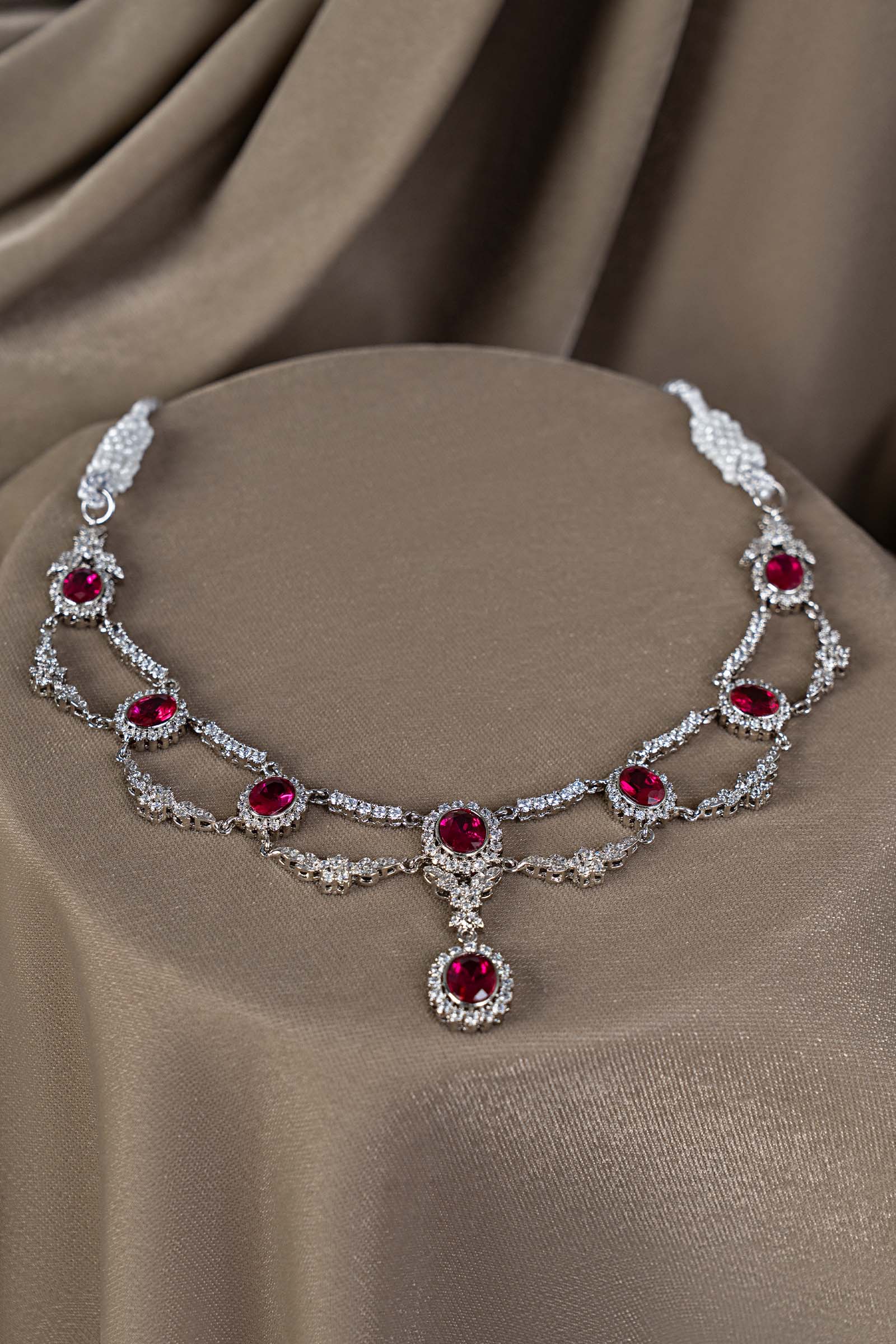 A vision of modern glamour, this necklace set glimmers with cascading white zircon artistry, catching light with every movement. At the center, radiant pink rhodolites pulse like a bold heartbeat, adding depth, drama, and allure. Finished with dori-tie, edgy yet poetic, it is crafted for the muse who thrives in the spotlight - where contemporary design meets unapologetic elegance. Composition: Silver Earrings Back Pin: Sterling Silver Stud Care Instructions: Wipe Clean