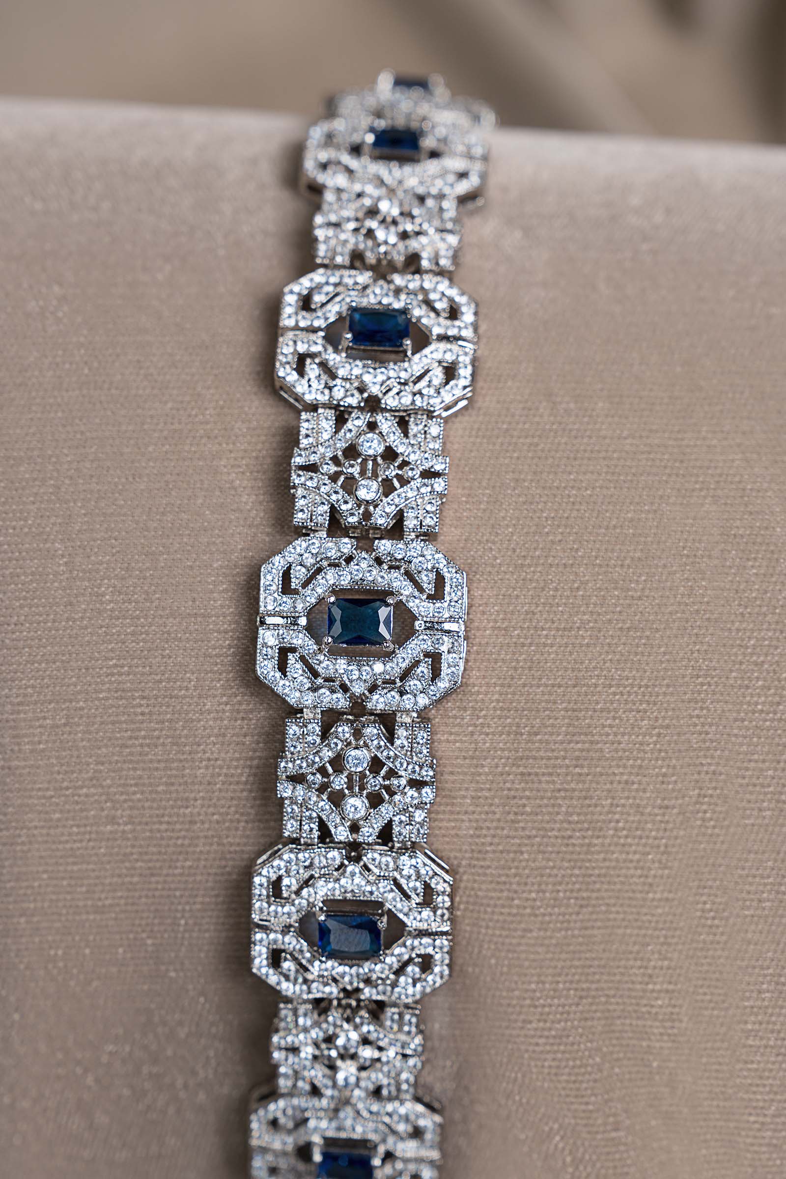 A cascade of sophistication and timeless allure, this modern necklace set shimmers with sculptural clusters of glistening white zircons, radiating bold elegance with glistening sapphire blue in center. Bold blue stones descend in striking hangings, adding depth, drama, and edge to the design. Finished with a sleek dori-tie, it is crafted for the modern muse - where poetic movement meets high-glam impact for an ultimate statement look.