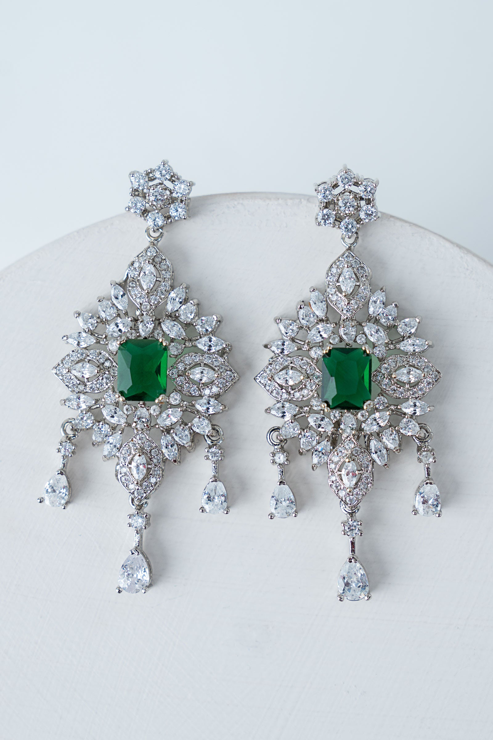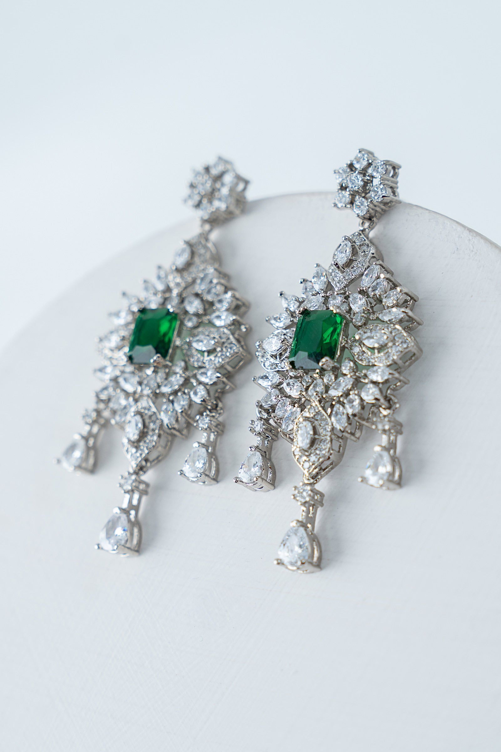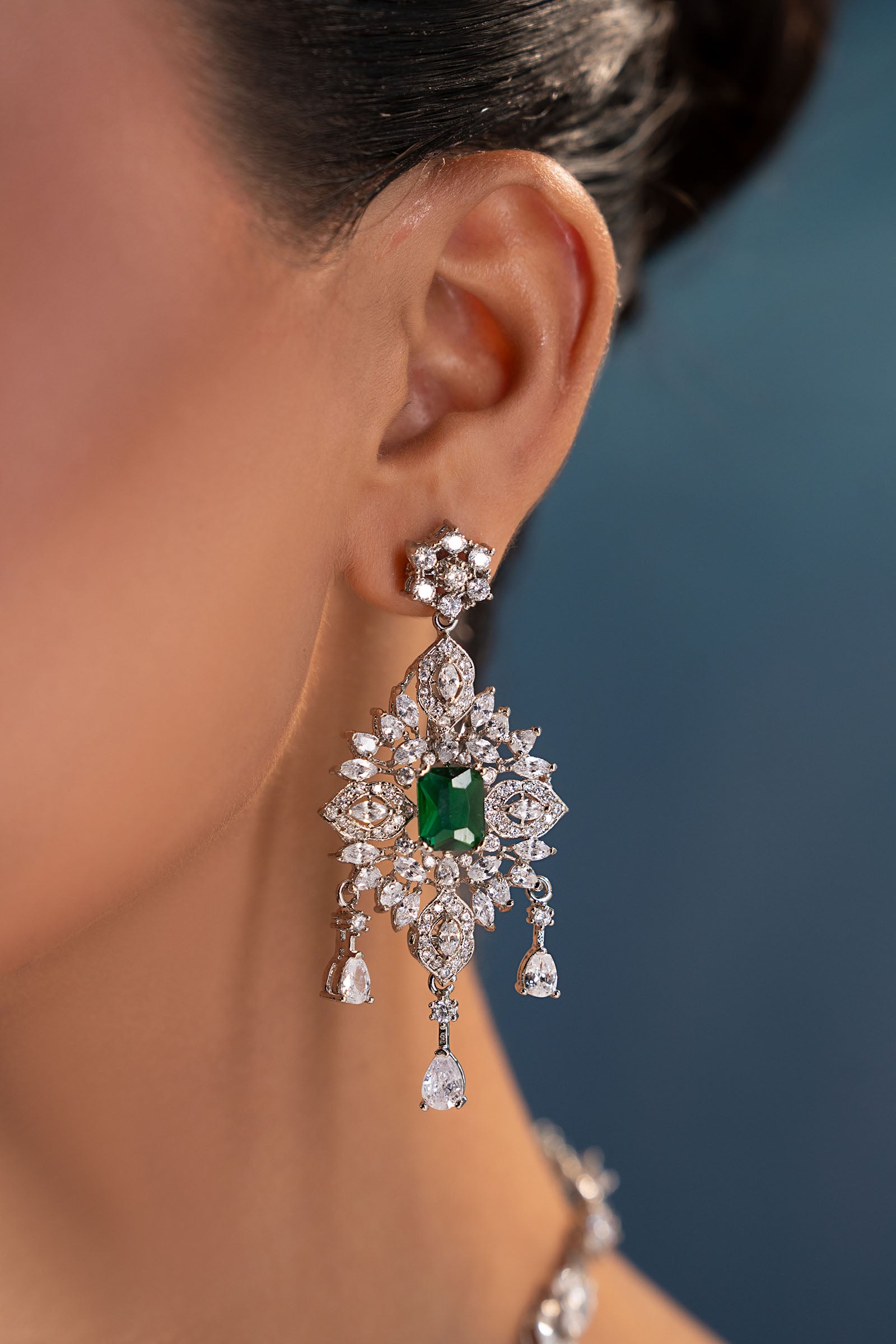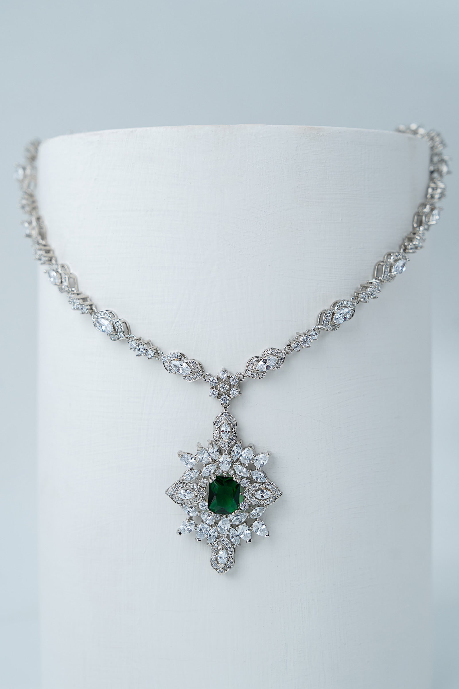 This 2Pc necklace and earrings set, which has a stunning combination of sparkling white zircons and deep emerald green, exudes contemporary elegance with a festive vibe. Bold yet elegant, it's made to add a new, fascinating glow to every occasion, fusing tradition with modern charm. Finish: Silver Back Pin: Sterling Silver Stud Lock: Spring Lock Product Care: Wipe Clean