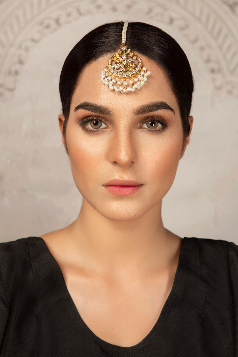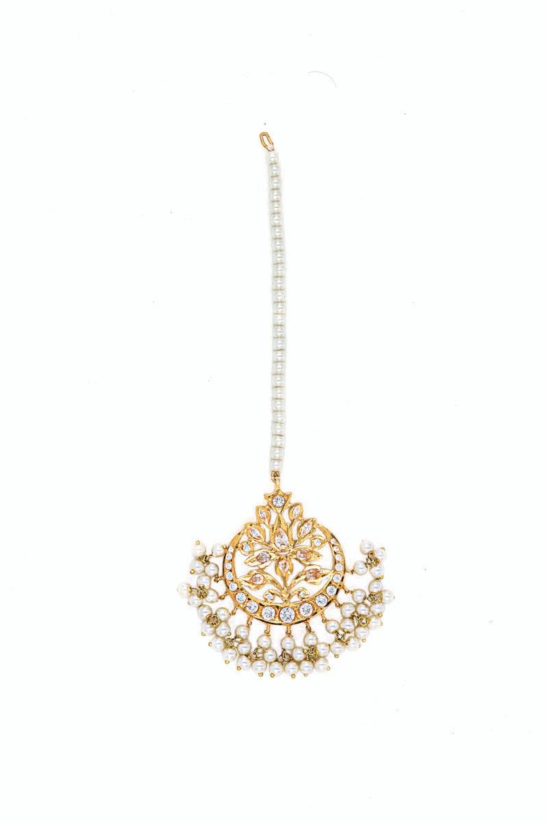 Multicolor maang tikka, faux pearl piroyi with handmade diamond cutting to give an exquiste look.
